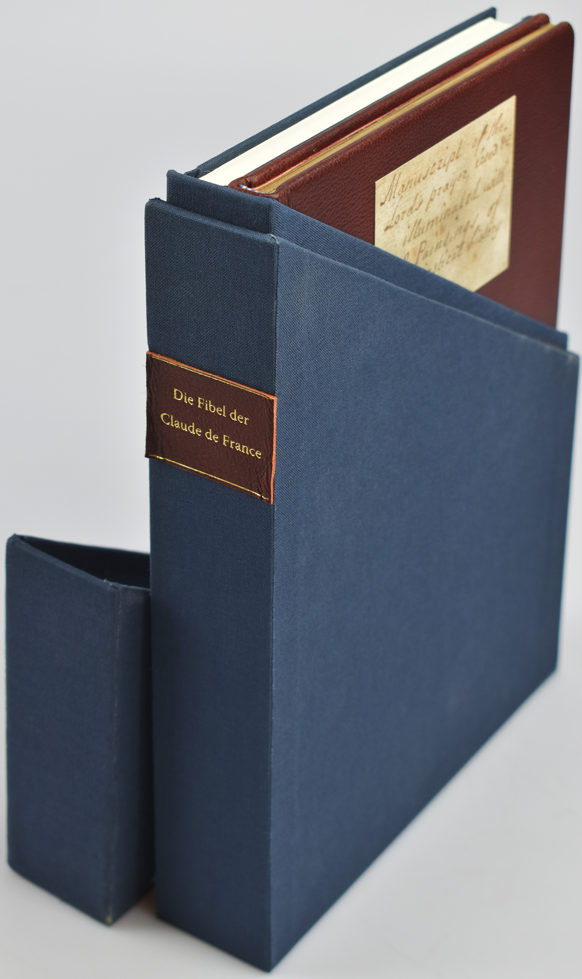Die Fibel der Claude de France. The primer of Claude de France. MS 159, the Fitzwilliam Museum, Cambridge. 2 Bände (Faksimile und Kommentarband, komplett). Luzern, Quaternio Verlag Luzern, 2012. 28 x 19,5 x 4,5 cm. [4], 15, [3] Blatt; 175 Seiten. Original-Lederband mit papiernen Deckelschildern, ledernen Spiegeln und marmorierten fliegenden Blättern und Original-Leinenband mit goldgeprägtem Rückentitel gemeinsam in geschlossenem Original-Leinenschuber mit goldgeprägtem Titel auf Lederschildchen.
