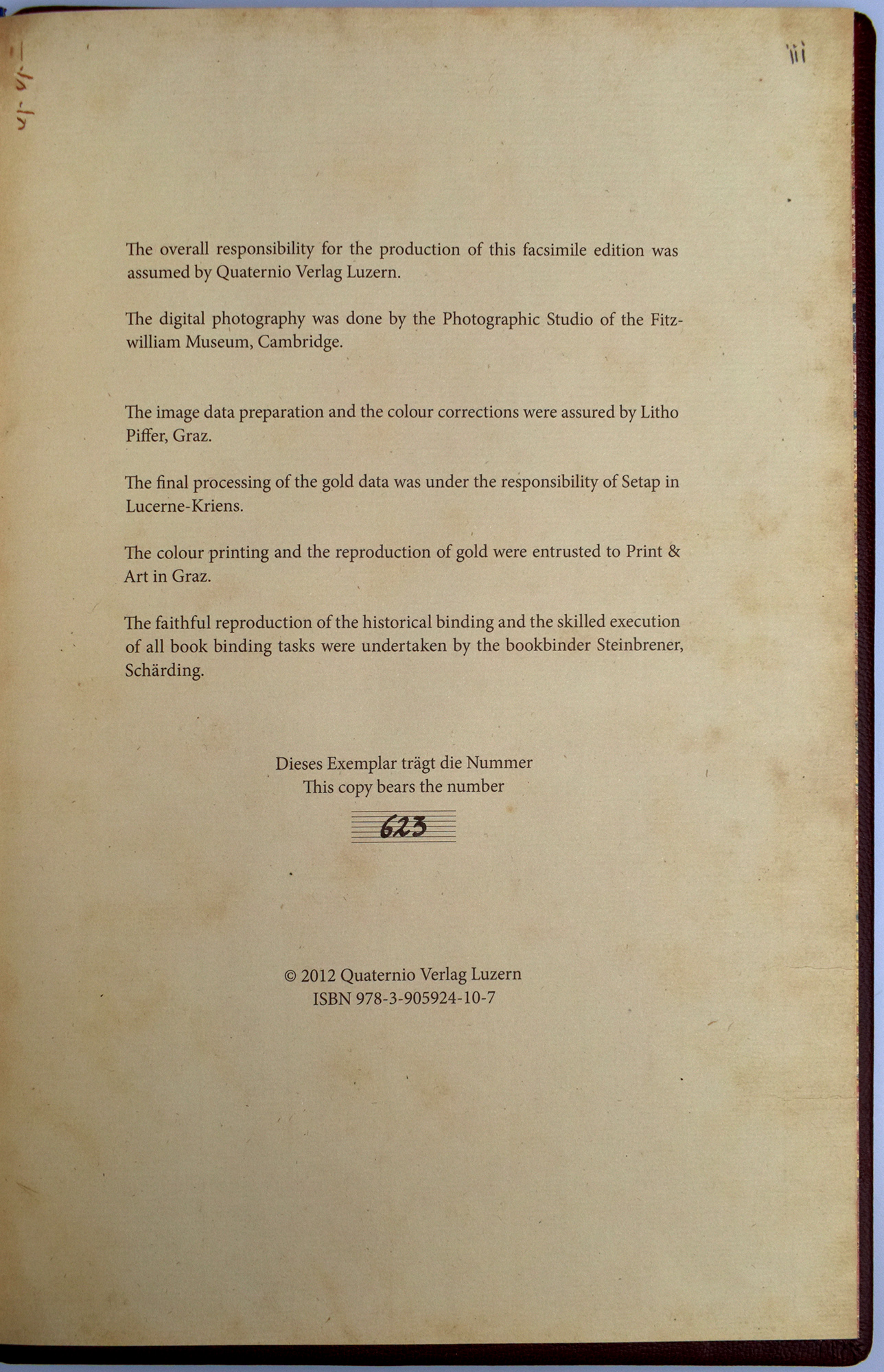 Original leather binding with paper title labels on the covers, leather pastedowns and marbled free endpapers, together with the original cloth-bound commentary volume with gilt-lettered spine, both housed in the original closed cloth slipcase with gilt title on a small leather label. Complete facsimile of MS 159 in the Fitzwilliam Museum, Cambridge. Copy no. 623 of 980 copies (total edition: 1,060 copies). Facsimile volume in Latin, commentary volume in German and English. With 2 full-page, gold-heightened colour miniatures with gilded architectural frames, and 36 smaller gold-heightened colour miniatures, arranged three to a decorative page, likewise set within gilded architectural frames with integrated colour vignettes and text, featuring blue or red decorative initials on gold grounds with floral elements. Rear endpaper with personalised publisher’s ex libris of the edition. Slipcase minimally rubbed and with two faint spots at the head. Fine copy.