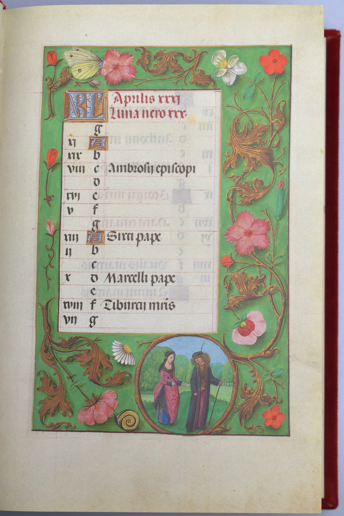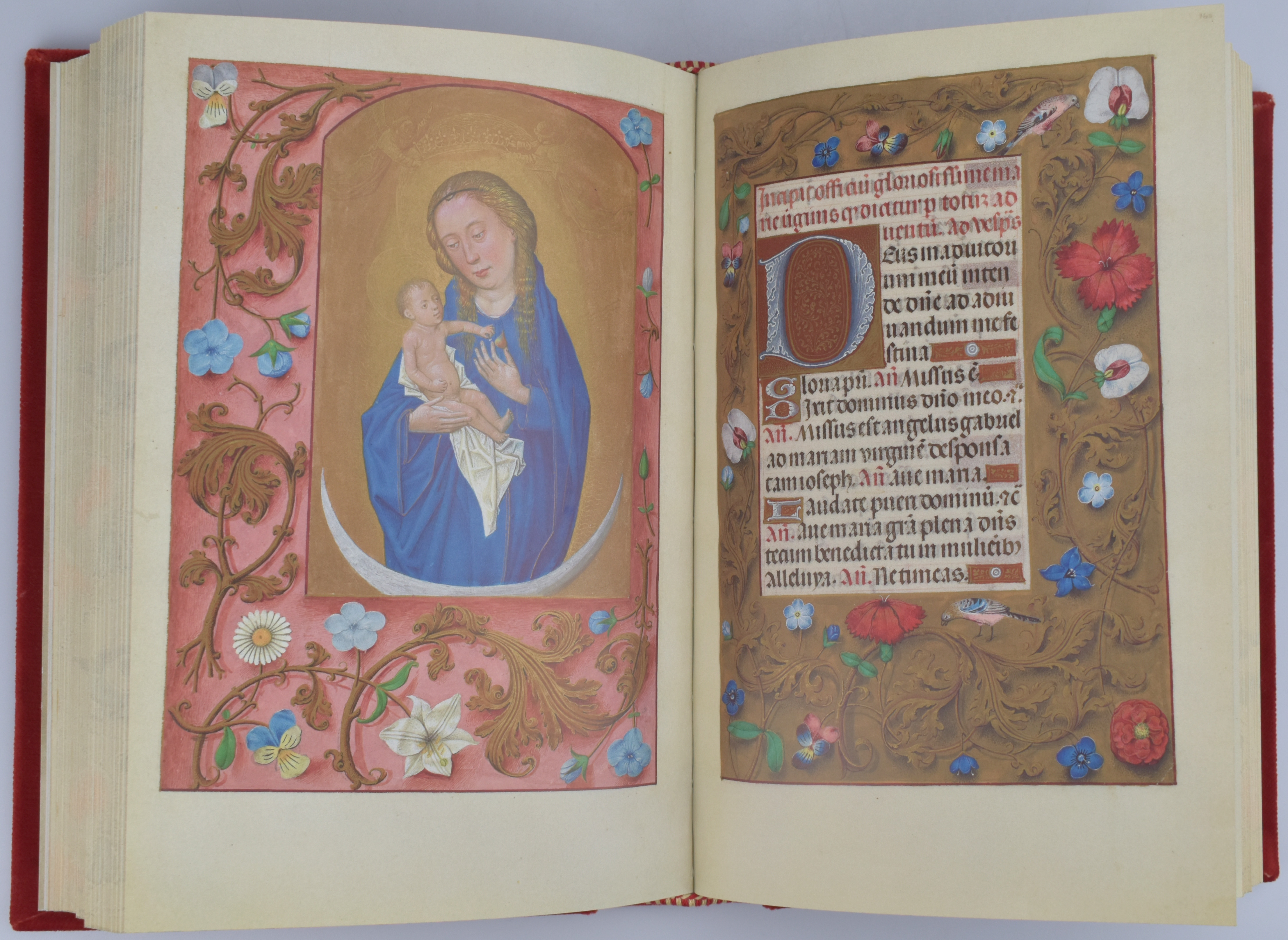 Red original velvet binding with heraldic decoration on the covers and gilt floral edges, in original leather slipcase with gilt decoration. Full facsimile of the illuminated manuscript held at the Cleveland Museum of Art, Cleveland, Ohio, USA, under the shelfmark MS 21/63.256. Number 159 of 980 Arabic-numbered copies (total edition: 1020 copies). Edition in Latin. With 40 full-page and 10 half-page miniatures in color and gold-heightened, 24 calendar medallions in color and gold-heightened, over 300 floral border ornaments in color, and numerous decorative initials on gold grounds. Mint copy.