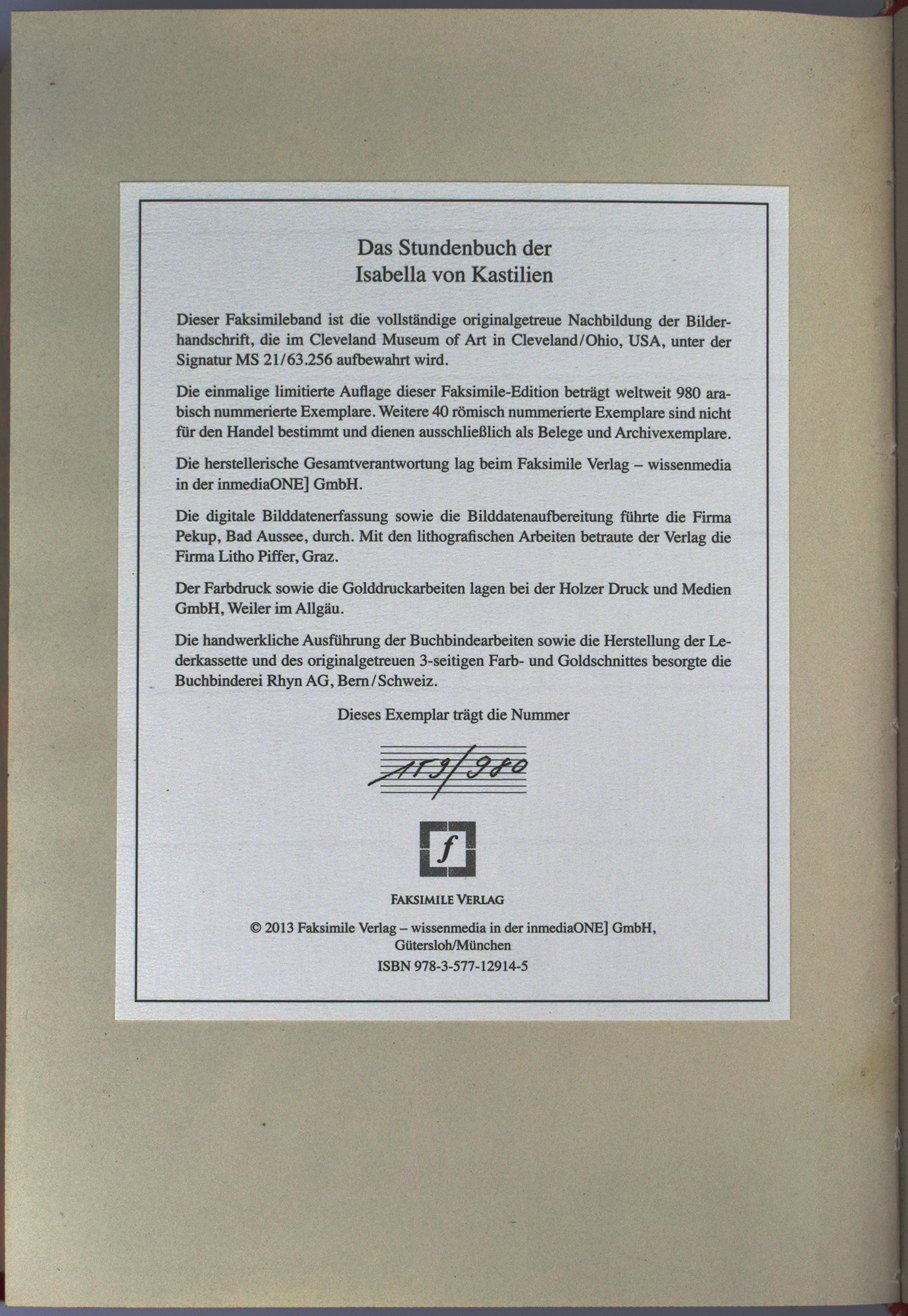 Vollfaksimile der Bilderhandschrift, die im Cleveland Museum of Art in Cleveland, Ohio, USA, unter der Signatur MS 21/63.256 aufbewahrt wird. Nummer 159 von 980 arabisch nummerierten Exemplaren (Gesamtauflage: 1020 Exemplare). Ausgabe in Latein. Mit 40 ganzseitigen und 10 halbseitigen Miniaturen in Farbe und goldgehöht, 24 Kalendermedaillons in Farbe und goldgehöht, über 300 floralen Randzierleisten in Farbe und zahlreichen Zierinitialen auf Goldgrund. Neuwertiges Exemplar.