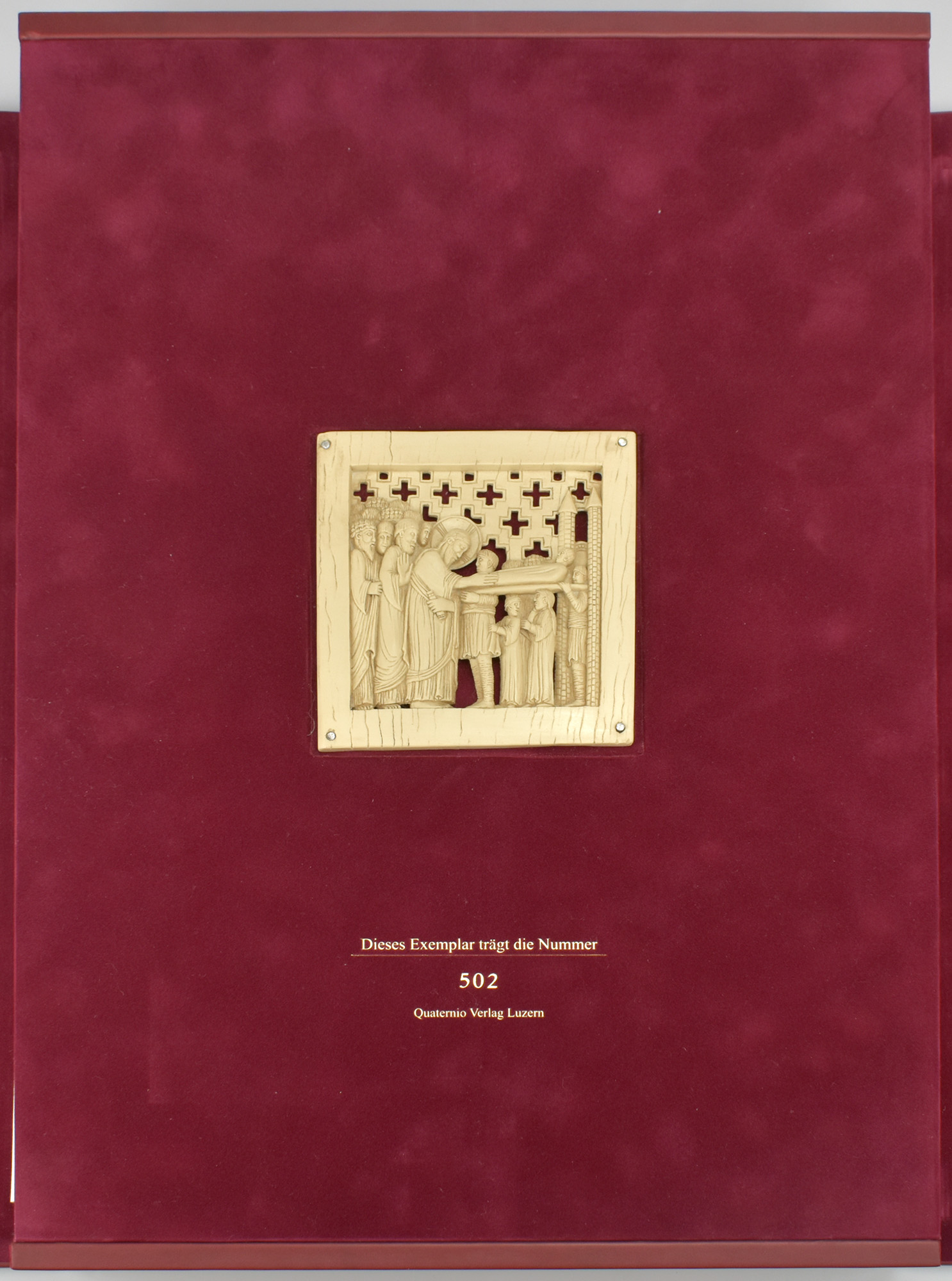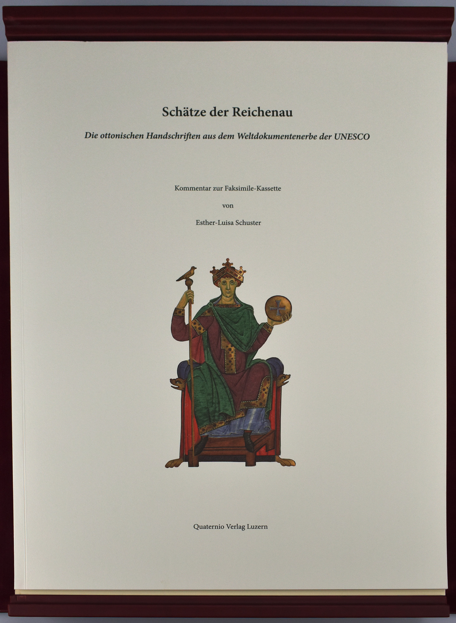 Schätze der Reichenauer Buchmalerei. Die ottonischen Handschriften aus dem Weltkulturerbe der UNESCO. Luzern, Quaternio Verlag, 2018. Broschur und Passepartouts: 44 x 33 cm. Kassette: 48,5 x 35 cm. 10 Faksimileblätter; 39 Seiten. 10 Faksimileblätter und Original-Broschur mit Deckelabbildung in Farbe in aufklappbarer Original-Lederkassette mit goldgeprägtem Rücken- und Deckeltitel sowie mit einer Replik einer geschnitzten Elfenbeintafel, die für den Magdeburger Dom geschaffen wurde, auf dem aufgelegten Kassettendeckel.