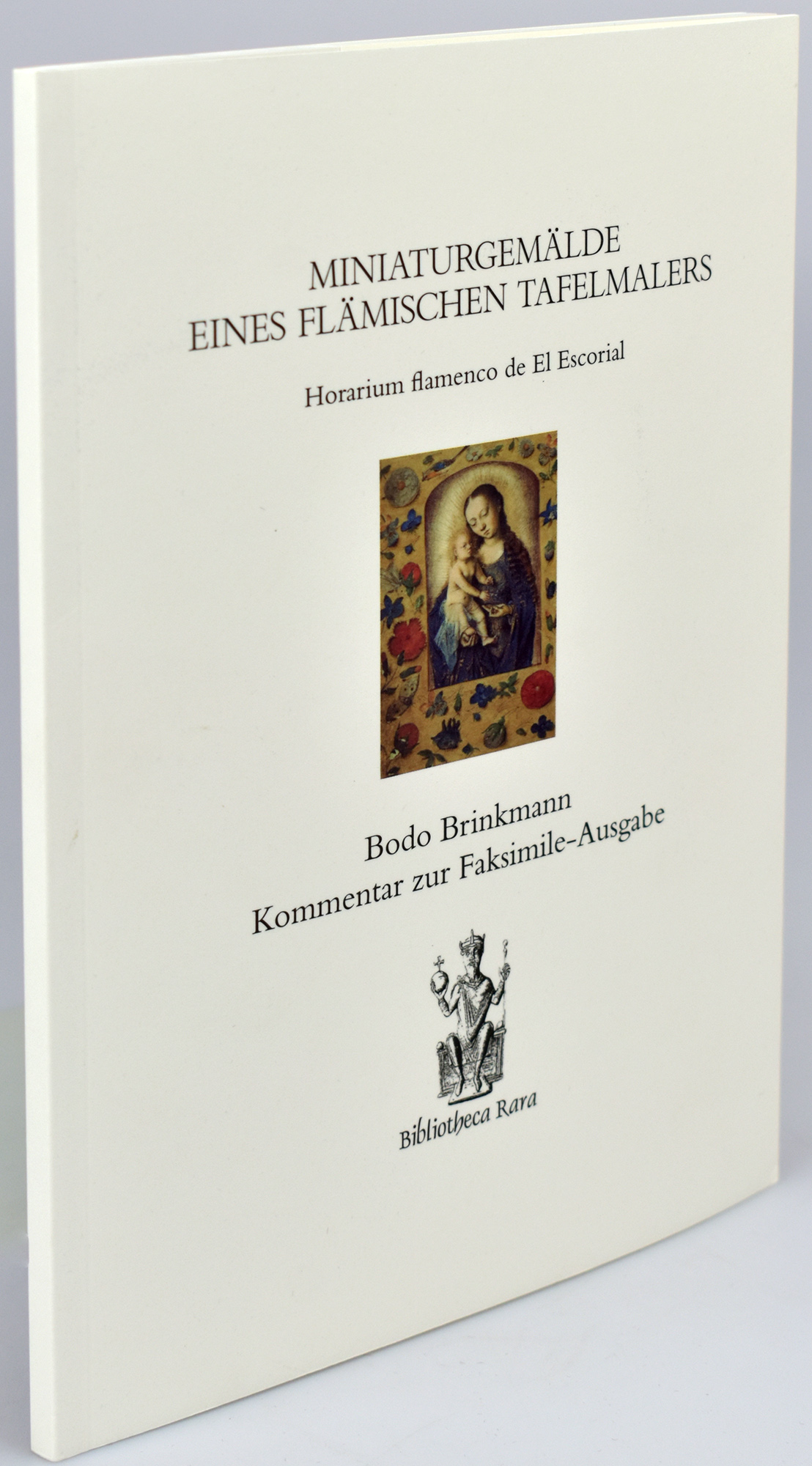 Nummer 908 von 980 Exemplaren der Gesamtauflage. Vollfaksimile des Ms. Vitrinas 12 der Real Biblioteca del Monasterio in San Lorenzo de El Escorial. Zweisprachige Ausgabe in Latein (Faksimile) und Deutsch (Kommentarband). Mit 16 Zierseiten mit fünfzeiligen Rankeninitialen in Blau auf Goldgrund und 4 Zierseiten mit achtzeiliger Miniatur in opulenten Schmuckrahmen sowie 15 ganzseitigen Minaturen ebenfalls umfasst von opulenten Schmuckrahmen. Beiliegender Kommentarband von Bodo Brinkmann mit dem Titel „Miniaturgemälde eines flämischen Tafelmalers. Horarium flamenco de El Escorial.“. Das Liber Horarum entstand 1486. Die konkrete Ausführung der Miniaturen des Stundesbuches wurden durch den Maler Jannieke Bollengier ausgeführt, der dafür auf Vorlagen des Dresdener Gebetbuchmeisters zurückgriff. Gerard David, der vor allem als Maler großformatiger Tafelbilder bekannt ist, überarbeitete diese danach in der für ihn charakteristischen Stricheltechnik. Motivisch bewegen sich die eindrucksvollen Miniaturen überwiegend im Bereich biblischer Darstellungen, die jeweils von opulenten Zierrahmen mit floralen und tierischen Motiven sowie Fantasiewesen eingefasst sind. Kassette leicht berieben, Schließe minimal oxidiert, ansonsten sehr gutes Exemplar.