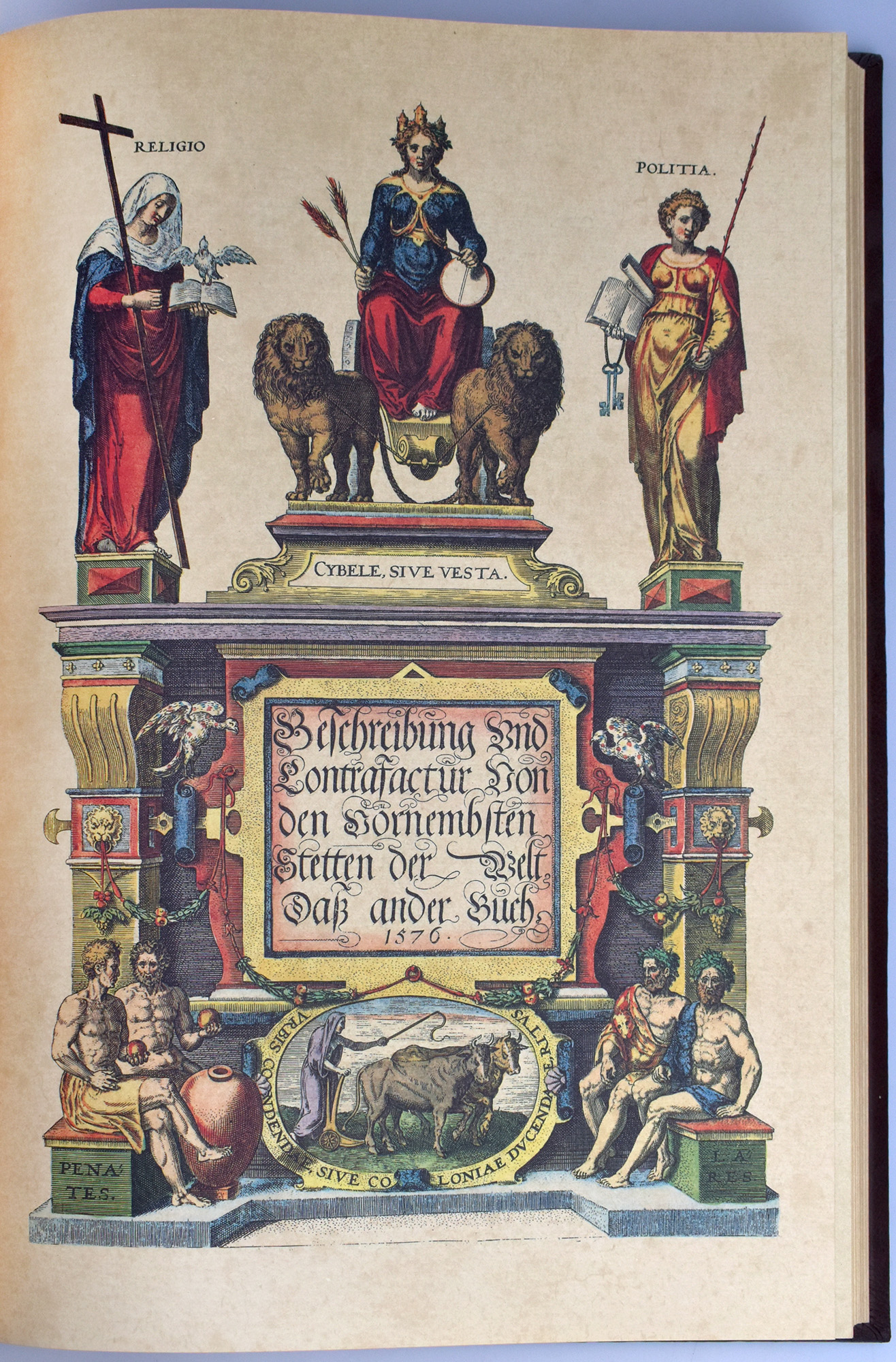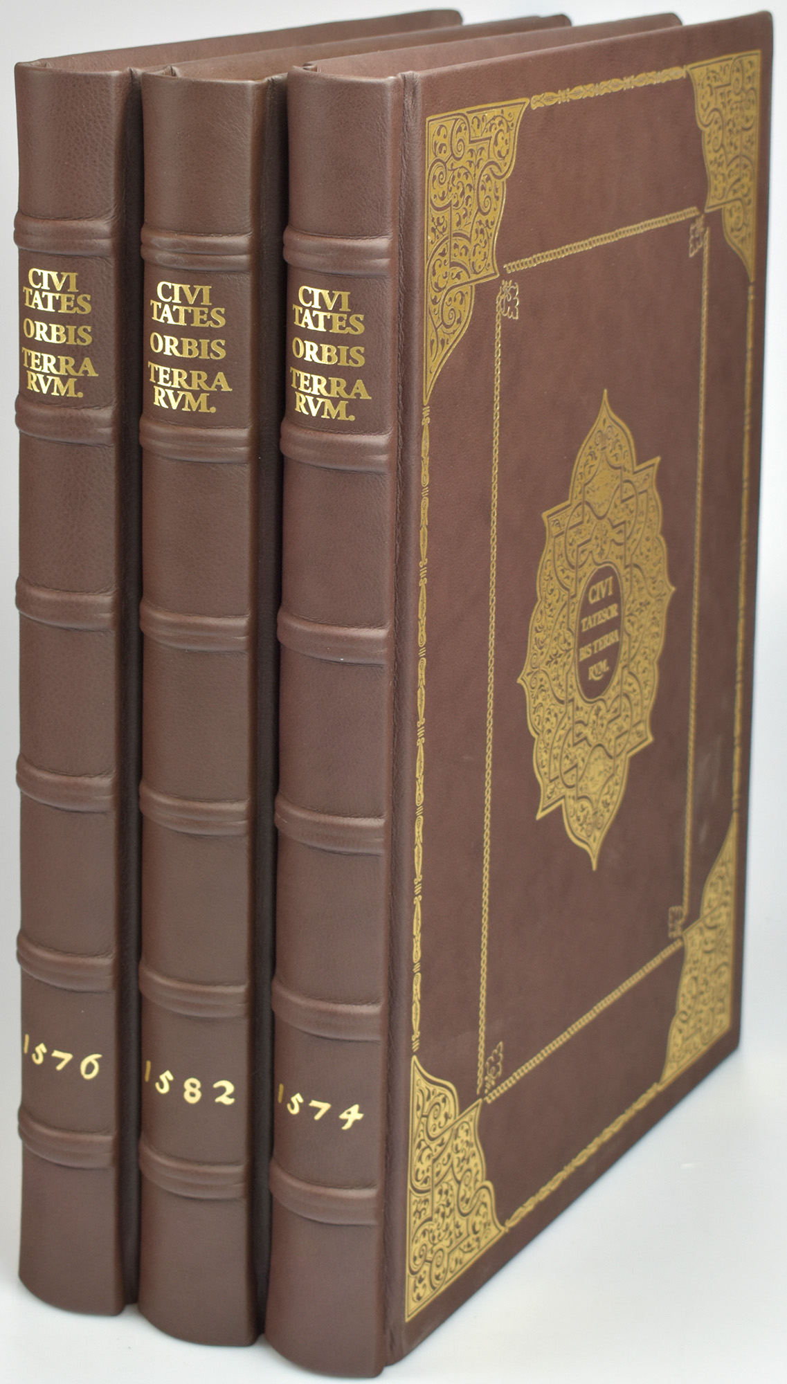 Braun, Georg: Beschreibung und Contrafactur der vornembster Stät der Welt. Civitates Orbis Terrarum. 1572, 1576 und 1582. 3 Faksimilebände (von 6) und 3 Kommentarbände (von 6). Simbach am Inn, Verlag Müller und Schindler, 2014-2016. 2° bzw. 4°. 42 x 28 cm bzw. 30 x 21 cm. [5] Blatt, 59 Doppeltafeln, [7] Blatt; [6] Blatt, 59 Doppeltafeln, [5] Blatt; [6] Blatt, 59 Doppeltafeln, [11] Blatt; 40; 15; 15 Seiten. Original-Lederbände auf 6 Bünden mit reicher ornamentaler Goldprägung und Rundum-Goldschnitt und Original-Broschuren.