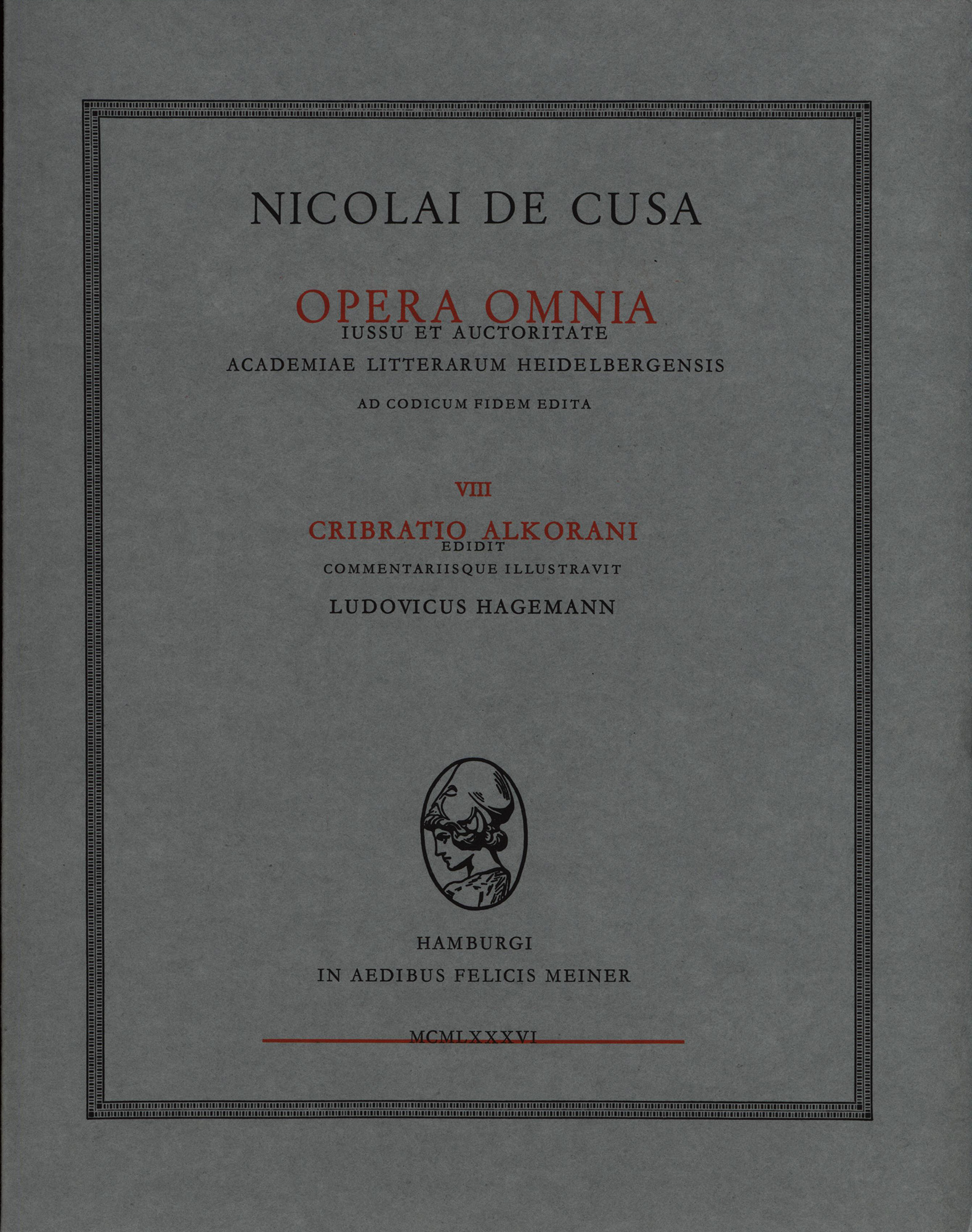 Nikolaus von Kues – Hagemann, Ludwig (Hrsg.): Nicolai de Cusa opera omnia. Volumen 8: Cribratio Alkorani. Hamburg, Meiner Verlag, 1986. 4°. 29 x 23 cm. XXXIX, 370 Seiten. Original-Broschur.