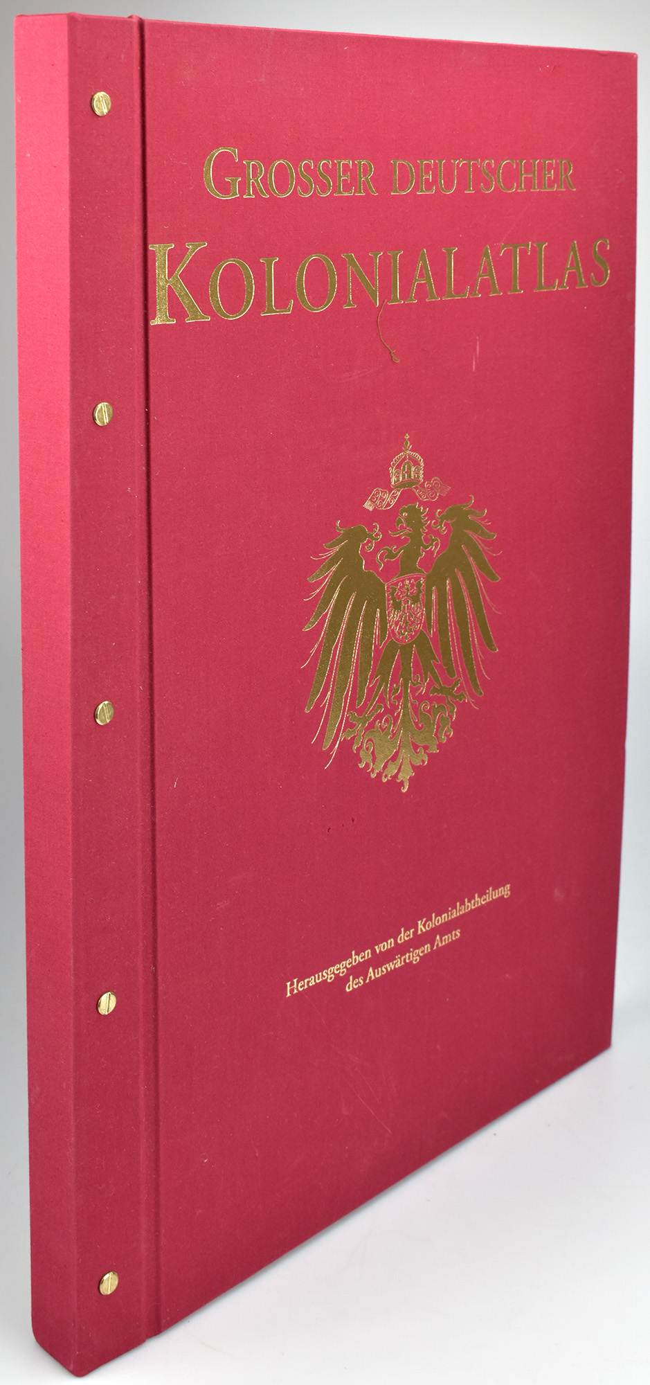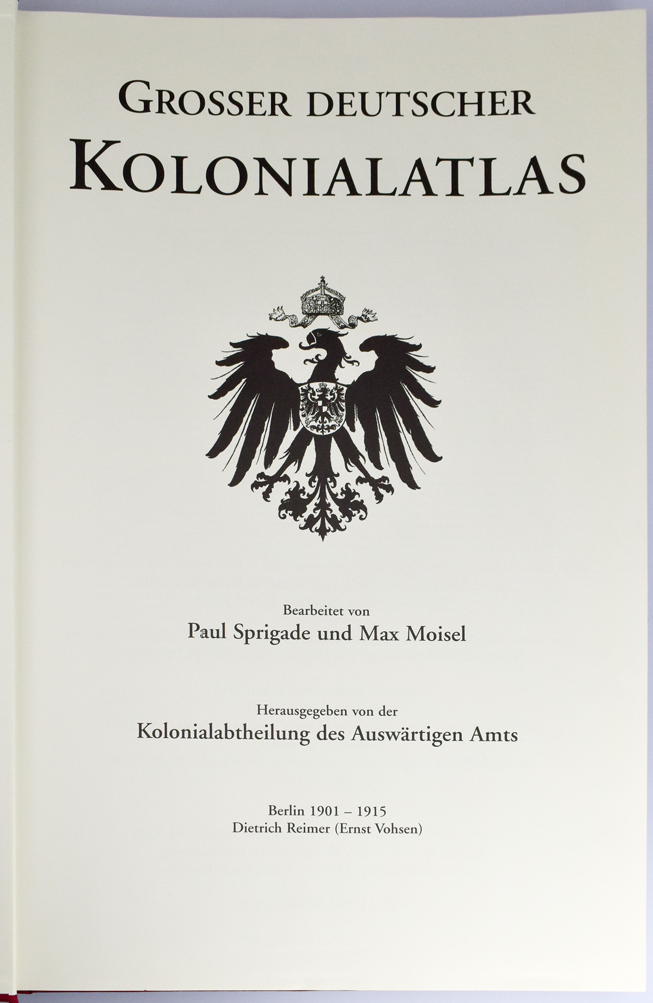 Sprigade, Paul (Hrsg.); Moisel, Max (Hrsg.): Großer deutscher Kolonialatlas. Berlin 1901 – 1915. Köln, Komet Verlag, 2010. 2°. 55,5 x 37,8 cm. [3] Blatt, 39 Karten, [15] Blatt. Original-Leinenband mit Goldprägung und Schraubenbindung.