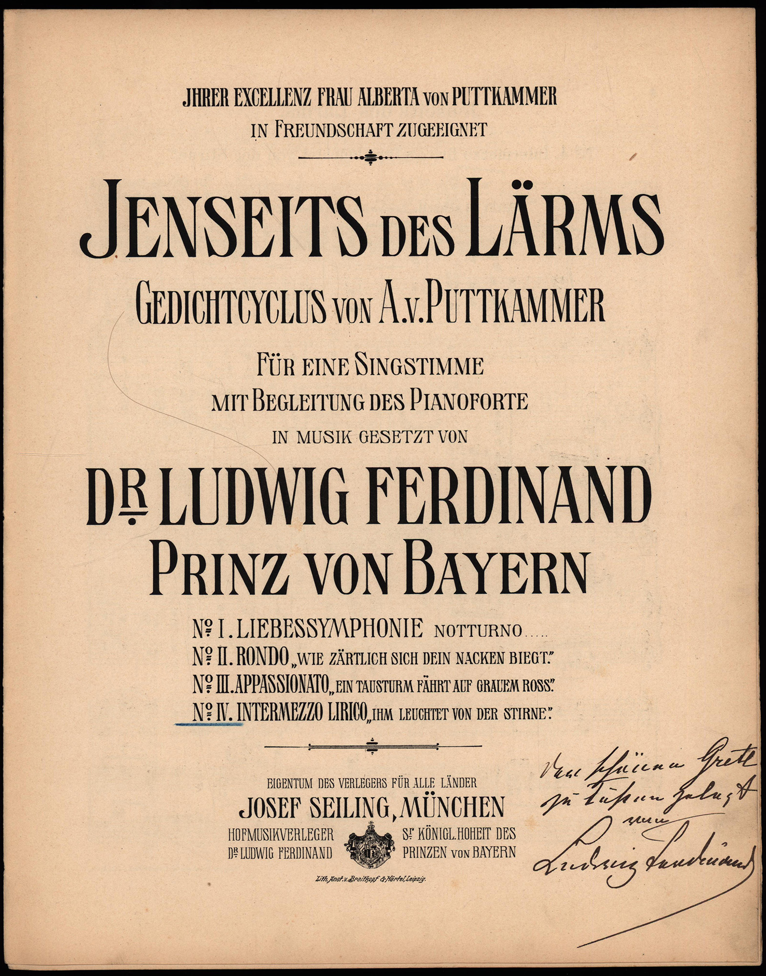 Ludwig Ferdinand von Bayern: Jenseits des Lärms. Gedichtcyclus von A. v. Puttkammer. Für eine Singstimme mit Begleitung des Pianoforte. Beigebunden: Derselbe: Flieder. Gedicht von O.J. Bierbaum. Für eine Singstimme mit Pianoforte. [Signiertes Widmungsexemplar]. München/Leizpig, Verlag Josef Seiling/Bartholf Senff, 1908/1905. 4°. 34,5 x 27,5 cm. 9; 5 Seiten. Original-Broschuren in Halbleinenband der Zeit.