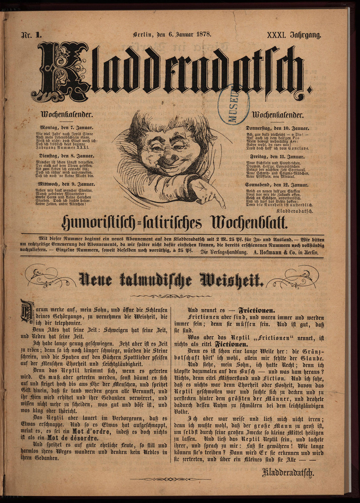 Kladderadatsch. Humoristisch-satirisches Wochenblatt. 31. Jahrgang 1878. 58 Nummern (in 1 Band, komplett). Berlin, Verlag A. Hofmann, 1878. 4°. 31,5 x 23,5 cm. 231 Seiten. Späterer Halblederband mit goldgeprägtem Rückentitel.