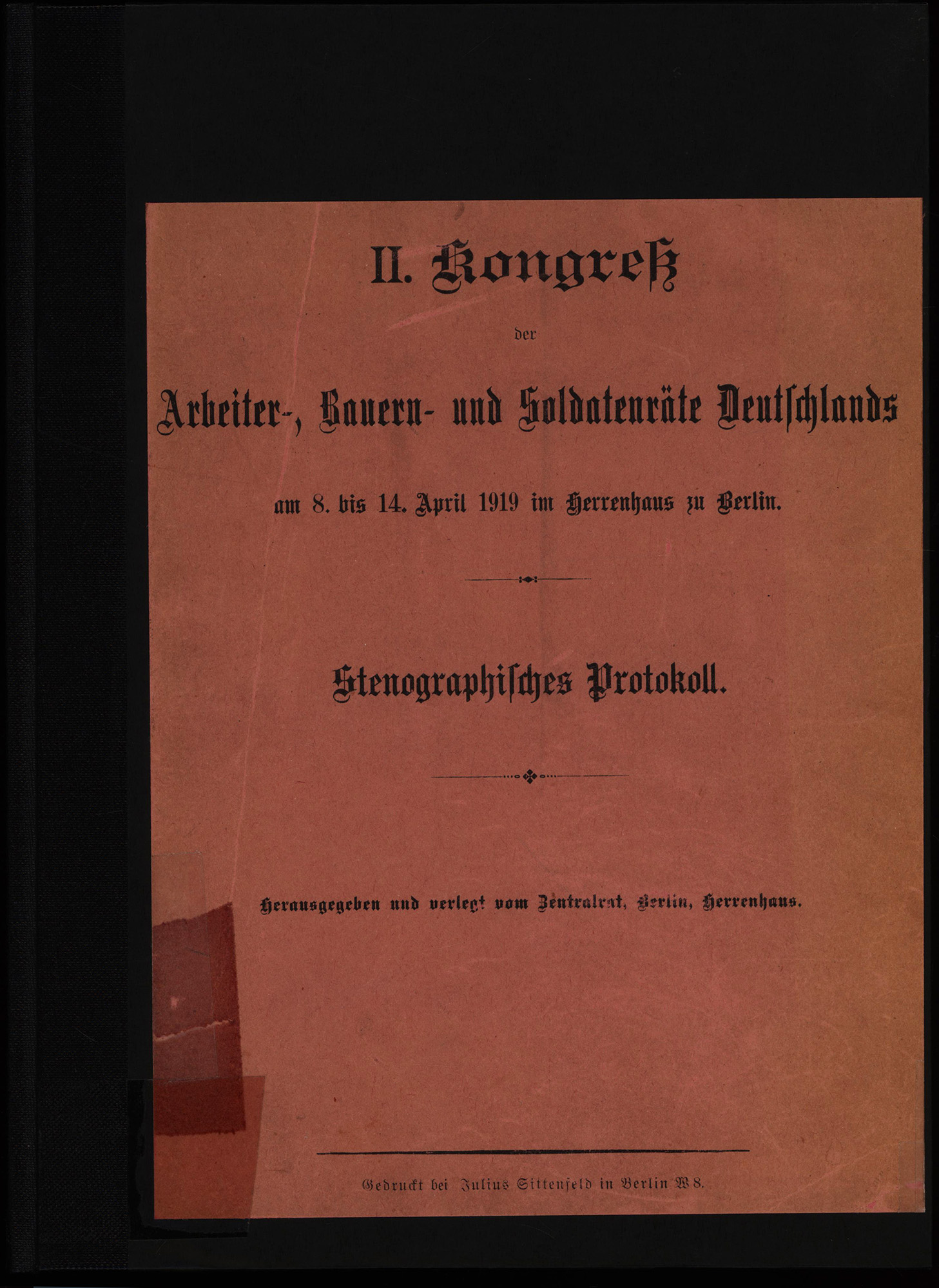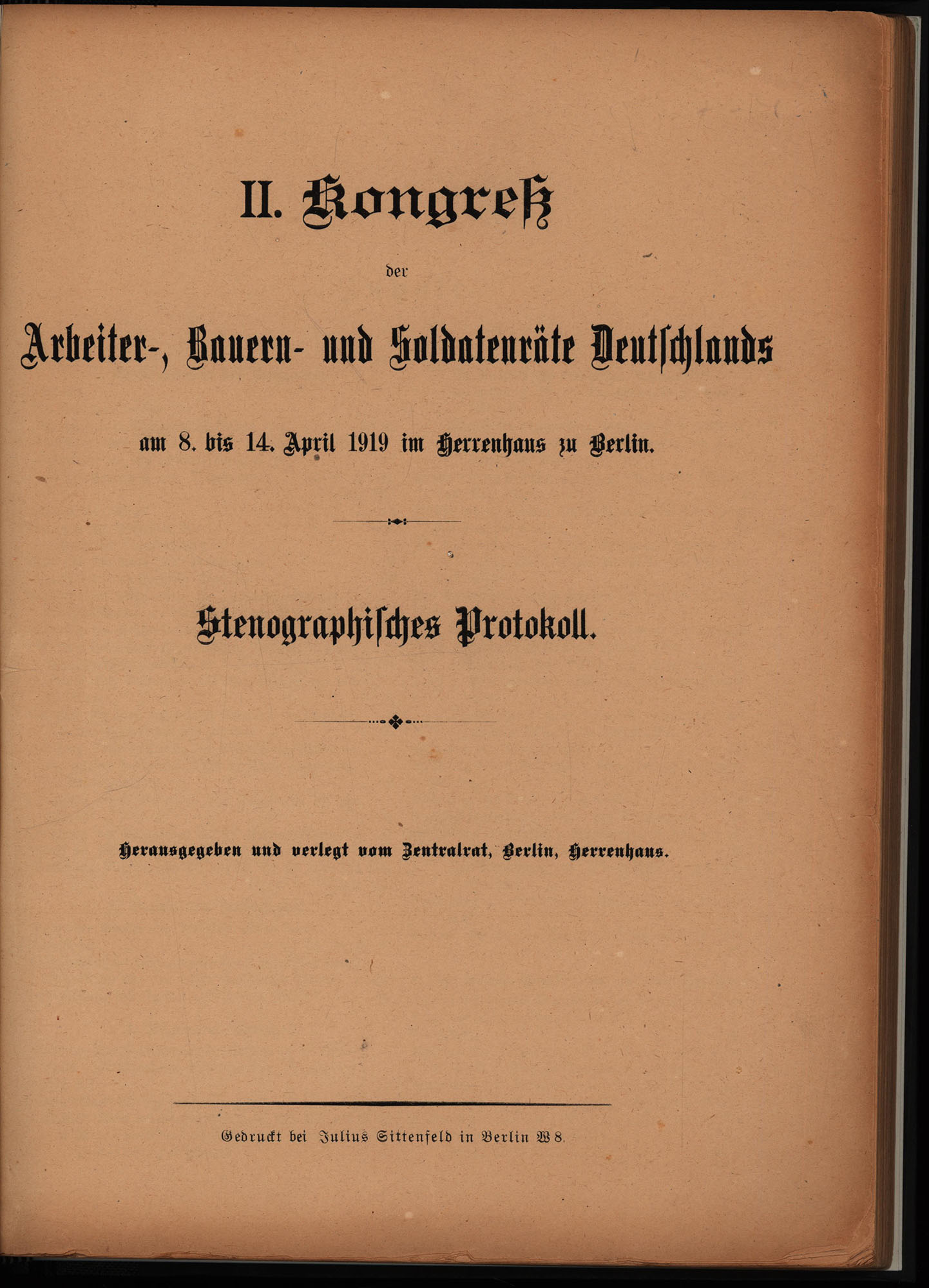 II. Kongreß der Arbeiter-, Bauern- und Soldatenräte Deutschlands am 8. bis 14. April 1919 im Herrenhaus zu Berlin. Stenographisches Protokoll. Herausgegeben und verlegt vom Zentralrat, Berlin, Herrenhaus. Berlin, gedruckt bei Julius Sittenfeld, 1919. 4°. 31,5 x 23,5 cm. 278 Seiten. Halbleinenband mit aufkaschiertem Vorderdeckel der Original-Broschur.