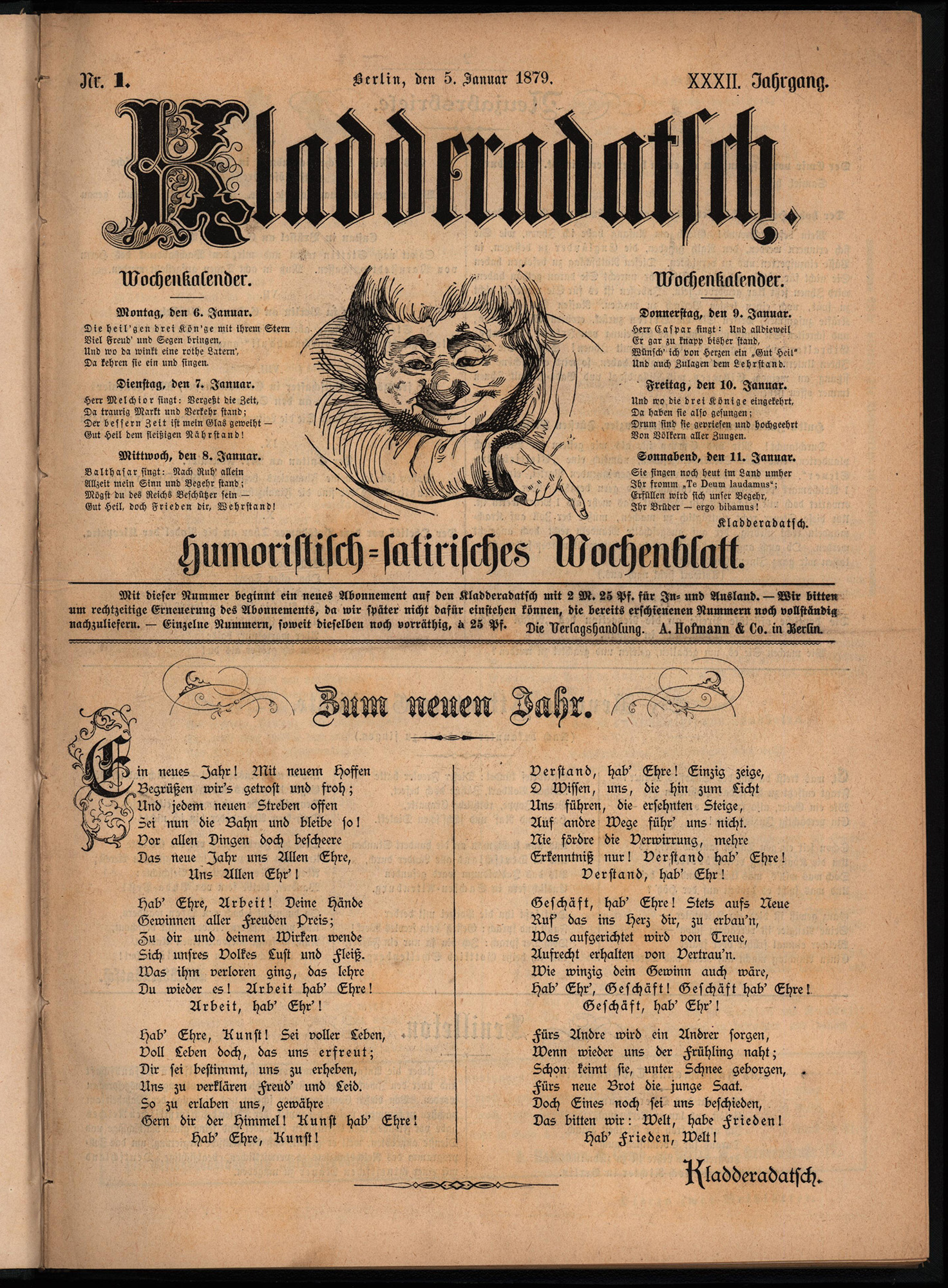 Kladderadatsch. Humoristisch-satirisches Wochenblatt. 32. Jahrgang 1879. 60 Nummern (in 1 Band, komplett). Berlin, Verlag A. Hofmann, 1879. 4°. 31,5 x 23,5 cm. 239 Seiten. Halbleinenband der Zeit mit goldgeprägtem Supralibros und goldgeprägtem Rückentitel.