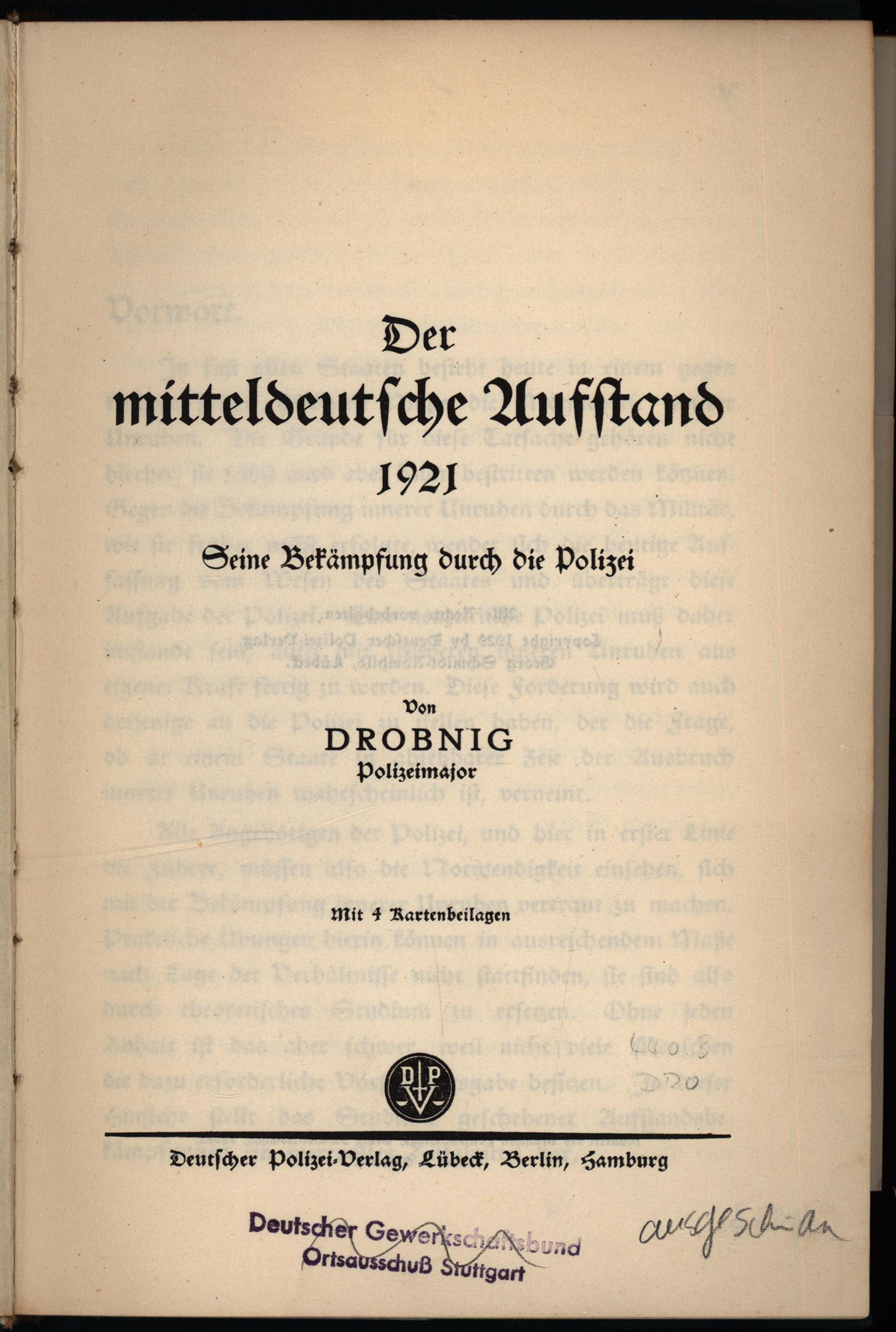 Drobnig, Walter: Der mitteldeutsche Aufstand 1921. Seine Bekämpfung durch die Polizei. Mit 4 Kartenbeilagen. Lübeck [u.a.], Deutscher Polizei-Verlag, 1929. 8°. 23 x 15,5 cm. XI, 180 Seiten. Original-Leinenband mit rotem Kopfschnitt.