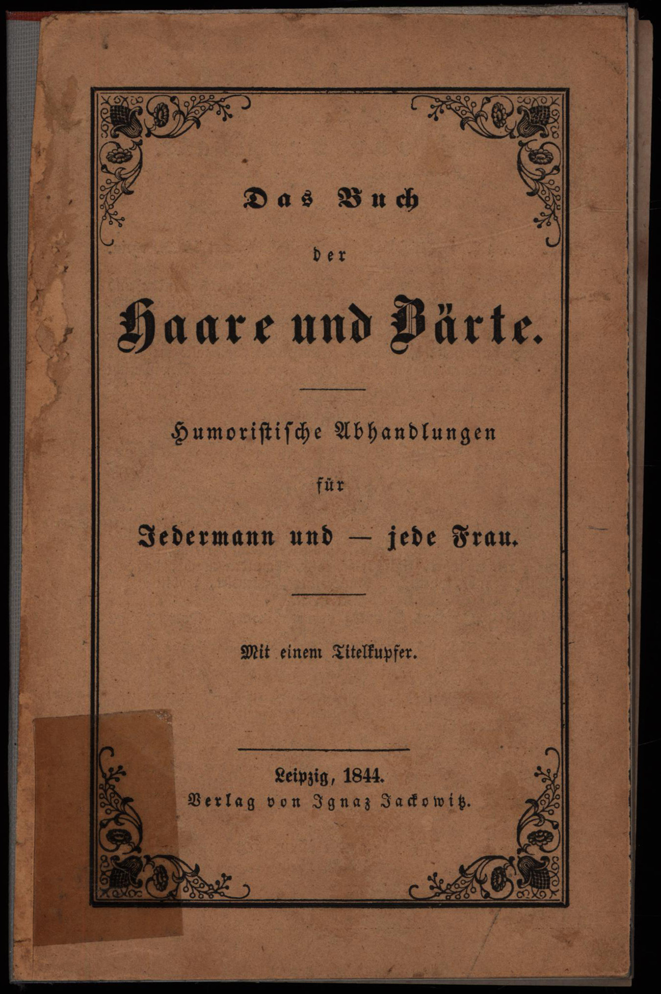 Das Buch der Haare und Bärte. Humoristische Abhandlungen für Jedermann und jede Frau. Mit einem Titelkupfer. Leipzig, Jackowitz Verlag, 1844. Klein-8°. 17 x 11 cm. VIII, 85 Seiten, [1] Blatt. Privater Handeinband aus zwei Pappdeckeln mit Gewebebandrücken und aufkaschierter Original-Broschur auf Deckel.