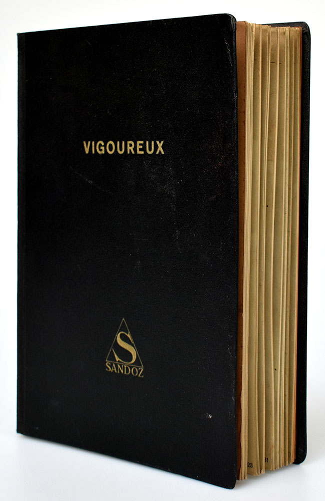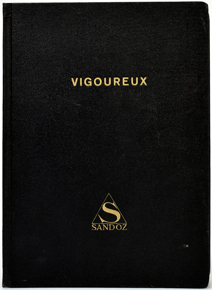 Vigoureux. Lanasyn, Lanasynrein+–, Walk- und Omegachromfarbstoffe im Vigoureuxdruck. Les colorants Lanasyne, Lanasyne purs+, foulon et Omégachrome dans l’impression Vigoureux. Vigoureux printing with Lanasyn, Lanasyn Brilliant+, Milling and Omega Chrome Colours. Basel, Sandoz AG, o. J. Groß-8°. 24,5 x 17,5 cm. 49 Seiten. Original-Leinenband mit goldgeprägtem Deckel- und Rückentitel. (= Nr. 1269/55).