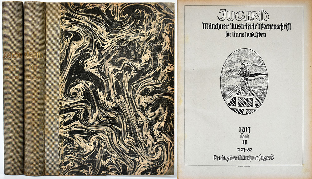Hirth, Georg [Hrsg.] Jugend. Münchner illustrierte Wochenschrift für Kunst und Leben. 1917 (in 2 Bänden). 51 Hefte (von 52). München, Verlag der Münchner Jugend, [1917]. 4°. 32,5 x 26 cm. [2] Blatt Inhaltsverzeichnis, 519 (1) Seiten. [2] Blatt Inhatsverzeichnis, Seiten (1) 522-563 (1), Seiten 575—1019 (1). Private Halbleinenbände mit goldgeprägten Rückentiteln und marmoriertem Bezugspapier.