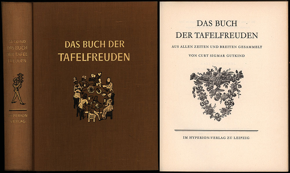 Gutkind, Curt Sigmar: Das Buch der Tafelfreuden. Aus allen Zeiten und Breiten gesammelt. Leipzig, Hyperion-Verlag, 1929. 4°. 25 x 20,5 cm. 643 Seiten. Original-Leinenband mit goldgeprägtem Deckel- und Rückentitel und Deckelillustration sowie gelbem Kopfschnitt..