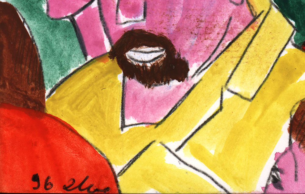 Aloe, Carlo Tomaso: Projekt 1001. Figürliche Zeichnung. [Unikat, Signiertes Original-Aquarell / Unique, signed original watercolour]. Das Projekt 1001 wurde 1996 von dem Kunstsammler Ralf Seilheimer ins Leben gerufen. Er schrieb 1001 Künstlerinnen und Künstler mit der Bitte an, ihm auf einer „nummerierten Blancokarte (10,5 x 14,8 cm) ein kleines Gefälligkeitskunstwerk zu zaubern…“ Carlo Aloe, geb. 1939 in Neuenburg, gest. 2023 [in Basel], Schweizer Künstler.