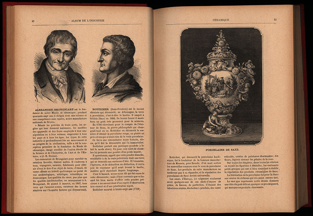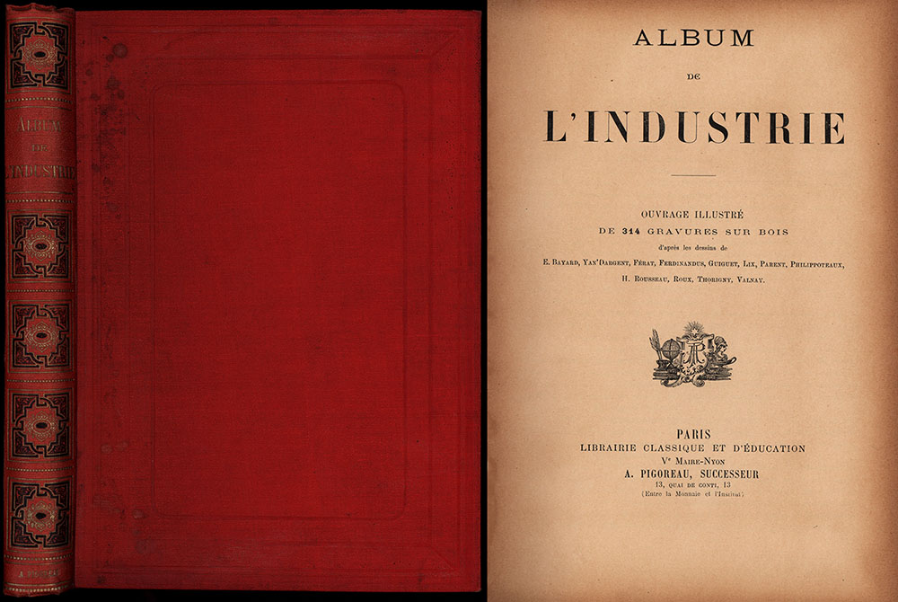 Bayard, E. [Ill.]: Album de l’industrie. Ouvrage illustré de 314 gravures sur bois d’apres les dessins de E. Bayard, Yan’Dargent, Ferat und anderen. Paris, Librairie classique et d’éducation, [ca. 1898]. 4°. 29 x 21 cm. VI, 296 Seiten. Roter Original-Leinenband mit goldgeprägtem Deckel- und Rückentitel. Rundum-Goldschnitt.