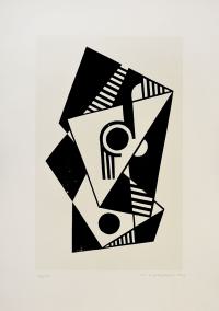 Wohlschlegel, Walter: Geometrische Komposition. 1957. [Signierter Original-Linolschnitt / signed original linocut]. Walter Wohlschlegel, geboren am 8. Juni 1907 in Tumringen, gestorben 1999 in Freiburg. Deutscher Maler des Expressionismus später des deutschen Informel. Studium 1930 bis 1935 an der Akademie Karlsruhe, Meisterschüler von Prof. Albert Haueisen.