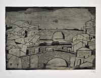 Willand, Detlef: Puente de Orbigo. [Signierter Original-Farbholzschnitt / signed original color woodcut]. (Detlef Willand, geboren am 14. April 1935 in Heidenheim an der Brenz, gestorben am 3. Januar 2022 in Hirschegg, Kleinwalsertal. Deutscher Holzschneider, Heimatforscher und Amateurarchäologe.
