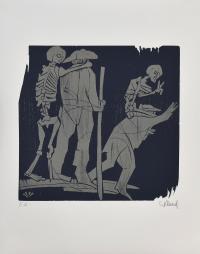 Willand, Pilger und Tod. Signierter Original-Farbholzschnitt