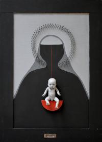 Weißkopff, Ohne Titel. Bildobjekt. Acryl auf Holz, Nägel, Puppe, signiert.