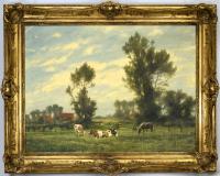 Wenzel, Leopold: Kühe und Pferd auf der Weide. [Signiertes Original-Ölgemälde, gerahmt / signed original oil painting, framed.] (Joseph Robert Leopold Wenzel, geb. 27.04.1885 in Elberfeld, gest. 1972 in Erkrath, deutscher Künstler, Porträt-, Landschafts- und Miniaturenmaler. Ab 1899 Ausbildung an der Kunstgewerbeschule Barmen, ab 1902 Studium an der Kunsthochschule Karlsruhe).