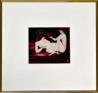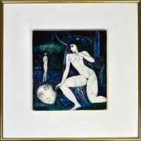 Weidenhaus, Elfriede: Figürliche Szene mit Schnecken. [Signierte handbemalte Fliese, gerahmt / signed handpainted tile, framed]. (Elfriede Weidenhaus, geb. 09.09.1931 in Berlin, gest. 01. oder 02. Januar 2023, deutsche Künstlerin, die sich auch als Ex Libris-Künstlerin einen Namen gemacht hat).