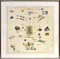 Lorbeer, Johan: Federn. [Assemblage, Collage auf Papier/ assemblage, collage on paper]. Johan Lorbeer, geboren 1950 in Minden. Studium an der Kunstakademie Nürnberg. In den späten siebziger Jahren begann der Künstler ein intermediales Werk zu entwickeln, das zwischen Zeichnung, Performance und Skulptur angesiedelt ist.