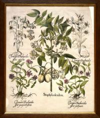 Besler, Basilius: I. Staphylodendron. II-V. Clematis daphnoides. [Gerahmter Original-Kupferstich / framed original colored copper engraving]. Eichstätt, 1613. Basilius Besler, geboren am 13. Februar 1561 in Nürnberg, gestorben 13. März 1629 ebenda, deutscher Apotheker, Botaniker und Verleger.