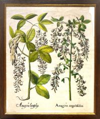 Besler, Basilius: I. Anagyris latifolys. II. Anagyris angustifoliis. [Gerahmter Original-Kupferstich / framed original colored copper engraving]. Eichstätt, 1613. Basilius Besler, geboren am 13. Februar 1561 in Nürnberg, gestorben 13. März 1629 ebenda, deutscher Apotheker, Botaniker und Verleger.