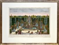 Probst, Georg Balthasar: Erstes Lustwasser des Irrgartens, zur rechten des Lustgartens [um 1740]. [Kolorierter Original-Kupferstich, gerahmt / original colored copper engraving, framed]. Georg Balthasar Probst, (1732–1801), deutscher Verleger und Graveur. Altkol. Kupferstich (Guckkastenblatt) von Johann Jakob Stelzer bei Georg Balthasar Probst, um 1760, 26,5 x 41 cm. Augsburger Guckkastenblatt im alten Kolorit. Gerahmt.