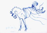Näher, Christa: Projekt 1001. Pferd. [Unikat, Signierte Original-Zeichnung / Unique, signed original drawing]. Das Projekt 1001 wurde 1996 von dem Kunstsammler Ralf Seilheimer ins Leben gerufen. Er schrieb 1001 Künstlerinnen und Künstler mit der Bitte an, ihm auf einer „nummerierten Blancokarte (10,5 x 14,8 cm) ein kleines Gefälligkeitskunstwerk zu zaubern…“ Christa Näher, geb. 24.02.1947 in Lindau am Bodensee, deutsche Künstlerin. Studium an der Hochschule der bildenden Künste in Berlin, dort Meisterschülerin von Marwan Kassab-Bachi. Seit 1987 Professur für Malerei, nun Honorarprofessur, an der Städelschule Frankfurt.