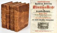 Du Halde, Jean Baptiste: Ausführliche Beschreibung des Chinesischen Reichs und der grossen Tartarey. Aus dem Französischen mit Fleiß übersetzet, nebst vielen Kupfern. 4 Bände (komplett). Rostock, Verlag Christian Koppe, 1747-1749. 4°. 26,5 x 21,5 cm. [1] Blatt, 58, 472 Seiten; [1] Blatt, 56, 748; 28 Seiten, [2] Blatt, 548; 56, 264, 552 Seiten, [16] Blatt. Ganzlederbände der Zeit auf 4 Zierbünden mit Streicheisenlinien auf den Deckeln und rotem Sprengschnitt.