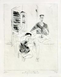 Kampmann-Hervest, Heinz: Spuren. 34 Original-Zinkätzungen, 18 Federzeichnungen. [Mit signierter Original-Grafik / with a signed original graphic art.] Wuppertal, Verlag Hans Putty, [1959]. Quer-Klein-8°. 15,5 x 21,5 cm. Unpaginiert. Original-Englischbroschur.