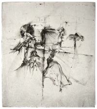 Sackenheim, Rolf: Ohne Titel, Einzelblatt. [19]56. [Signierte Original-Grafik / signed original graphic]. (Rolf Sackenheim, geb. 26.09.1921 in Koblenz, gest. 09.01.2006 in Düsseldorf. Deutscher Künstler und Grafiker. Kunststudium in Karlsruhe von 1943/1947 bis 1950 bei Karl Hubbuch, 1952 an der Kunstakademie Düsseldorf, Meisterschüler von Otto Coester. Ab 1963 Dozent an der Kunstakademie Düsseldorf, später als Professor und Leiter der Klasse für Druckgrafik).
