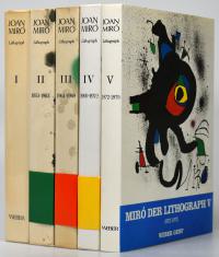 Miro, Joan – Mourlot, Fernand: Joan Miro. Der Lithograph. Band 1-5. 5 Bände. Band 1: Michel Leiris. Änderungen und Ergänzungen, 1970. Über Joan Miro, 1947. Katalog und Notizen von Fernand Mourlot. Band 2: 1953-1963. Vorwort von Raymond Queneau. Band 3: 1964-1969. Vorwort von Joan Teixidor. Band 4: 1969-1972. Vorwort von Nicolas und Elena Calas. Band 5: 1972-1975. Verzeichnis zusaammengestellt von Patrick Cramer. Genf, Weber, 1972-1992. 4°. 32,5 cm. 231, 248, 207, 208 und 190 Seiten. Original-Leinenbände mit Original-Schutzumschlägen, die ersten vier Bände mit zusätzlichem Original-Klarsichtumschlag.
