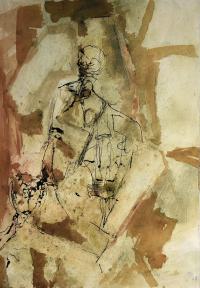 Batz, Eugen: Abstrahierter Mann. [19]64. [Signiertes Original-Aquarell / signed original watercolor]. (Eugen Batz, geb. 07.02.1905 in Velbert, gest. 12.10.1986 in Wuppertal. Deutscher Maler und Fotograf, Schüler des Bauhauses und ein wichtiger Vertreter der Abstrakten Malkunst Deutschlands in der Nachkriegszeit und ein bedeutender künstlerischer Fotograf. Ab 1929 Schüler am Bauhaus Dessau bei Josef Albers, Joost Schmidt, Fotografie-Unterricht bei Walter Peterhans, Zeichenunterricht bei Wassily Kandinsky und Besuch der Freien Malklasse von Paul Klee. 1931 wechselte Batz an die Kunstakademie Düsseldorf und wurde dort Meisterschüler von Paul Klee. 1932 Teilnahme an der Ausstellung „Das junge Rheinland“ in der Villa in der Königsallee in Düsseldorf).