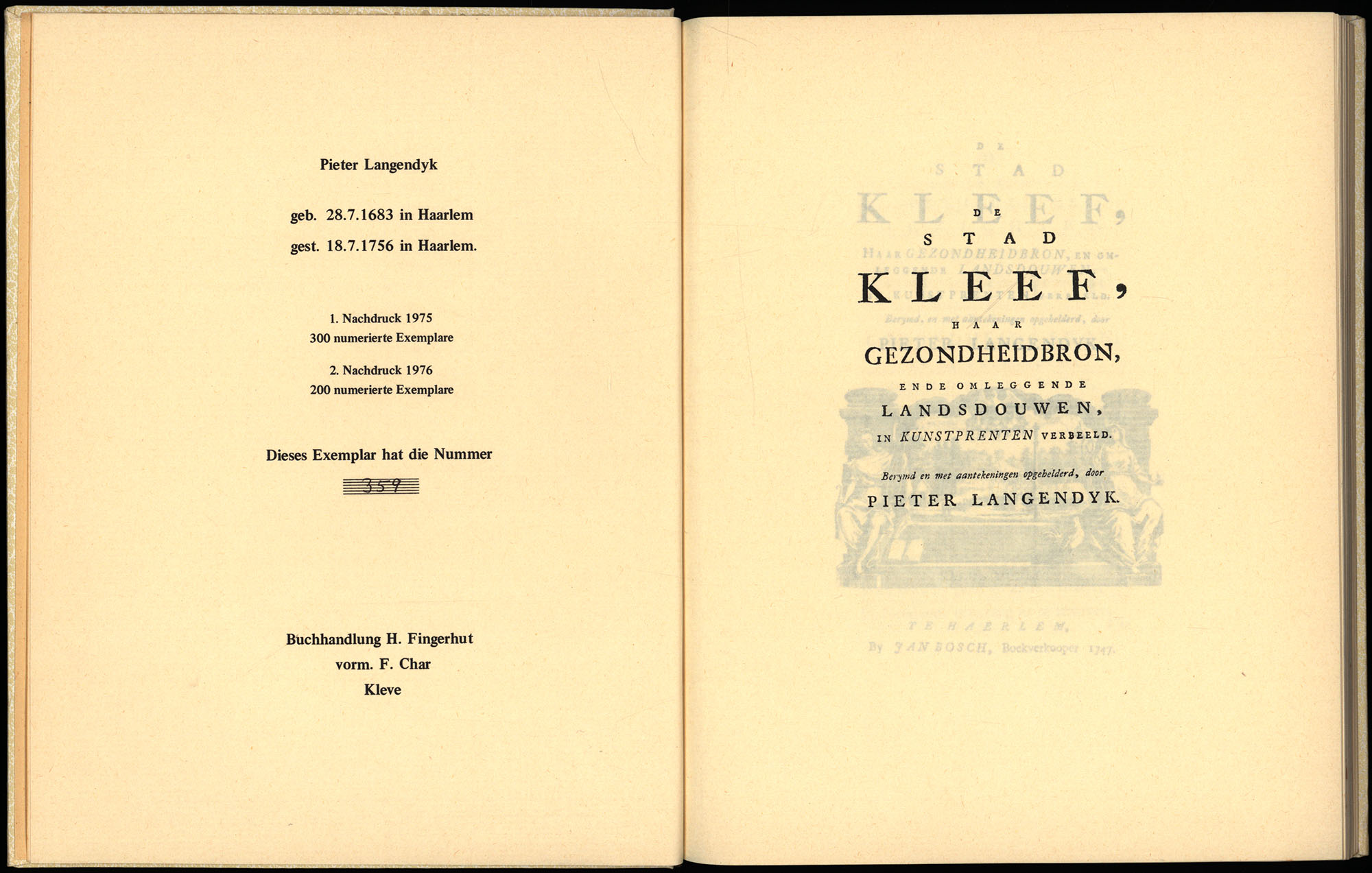 Langendijk, Pieter: De Stad Kleef, haar Gezondheidbronn, ende omleggende Landsdouwen, in Kunstprenten verbeeld. Kleve, Verlag der Buchhandlung Fingerhut, 1976. Groß-8°. 26,5 x 21 cm. 63 Seiten, (1) Blatt. Original-Lederband.