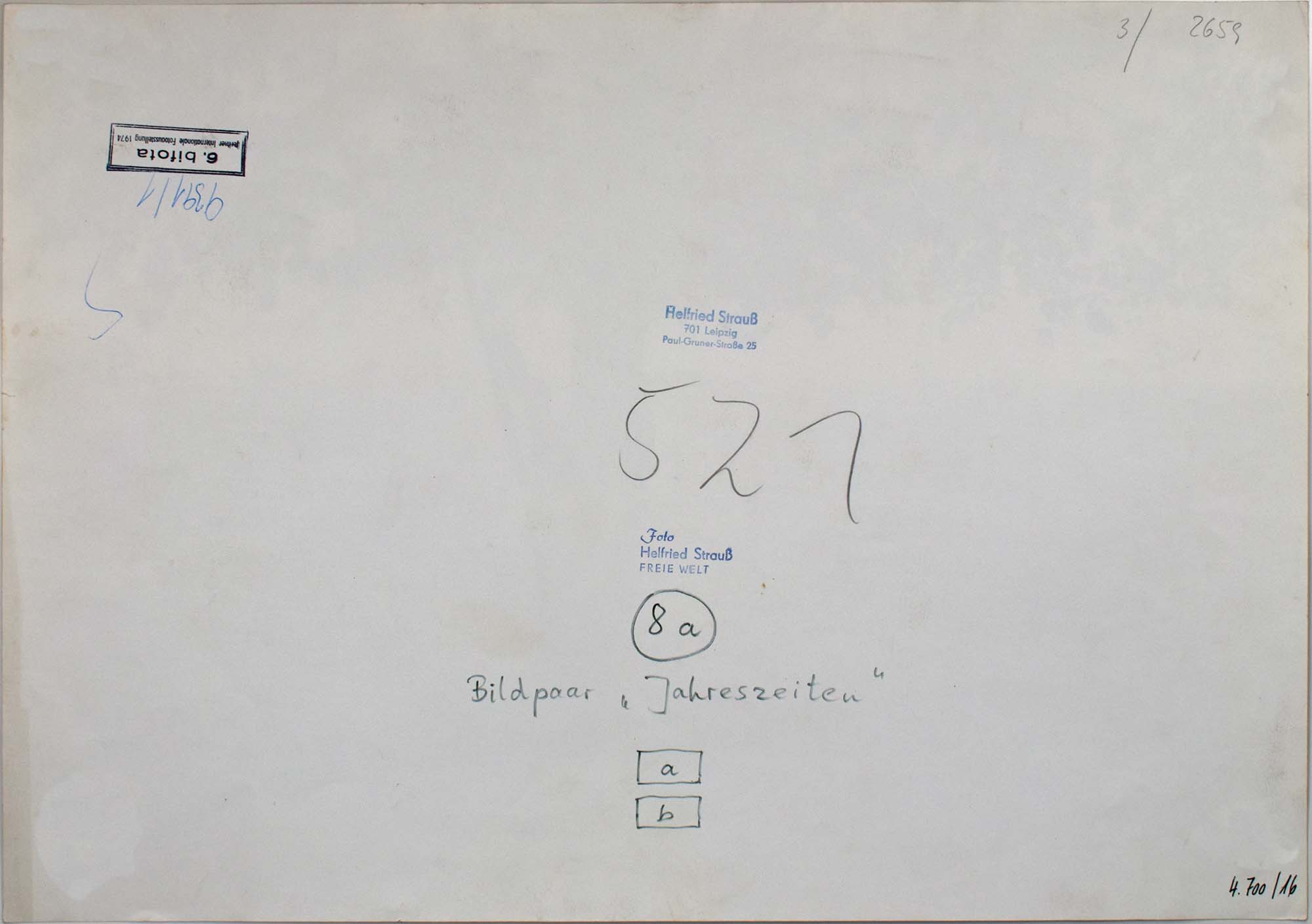 Original-Fotografie von Helfried Strauß in Schwarz-Weiß, rückseitig mit Stempel „Helfried Strauß, Leipzig“ und „6. bifota – Berliner Internationale Fotoausstellung 1974“, handschriftlich bezeichnet als „Bildpaar Jahreszeiten“, hier nur eine Fotografie des „Paares“. Maße: 35,0 x 49,8 cm. Provenienz: Aus dem Nachlass des Kunstsammlers und Autors Ralf Seilheimer, mit seiner Inventarnummer auf der Rückseite. Obere linke Ecke und rechter Blattrand mit Knickspur (letzterer vorderseitig kaum sichtbar). Blatt rückseitig leicht fleckig. Insgesamt noch sehr guter Zustand.