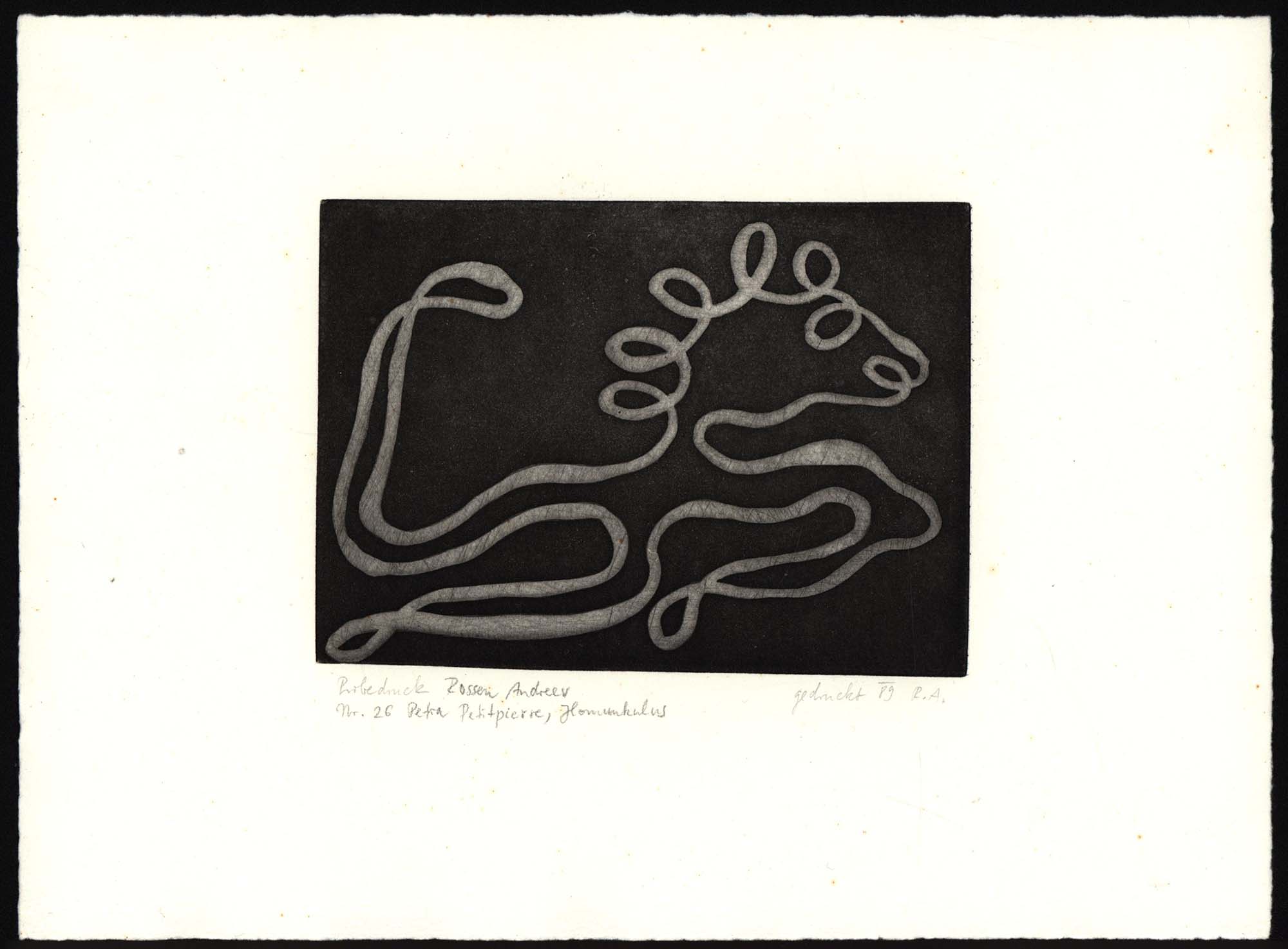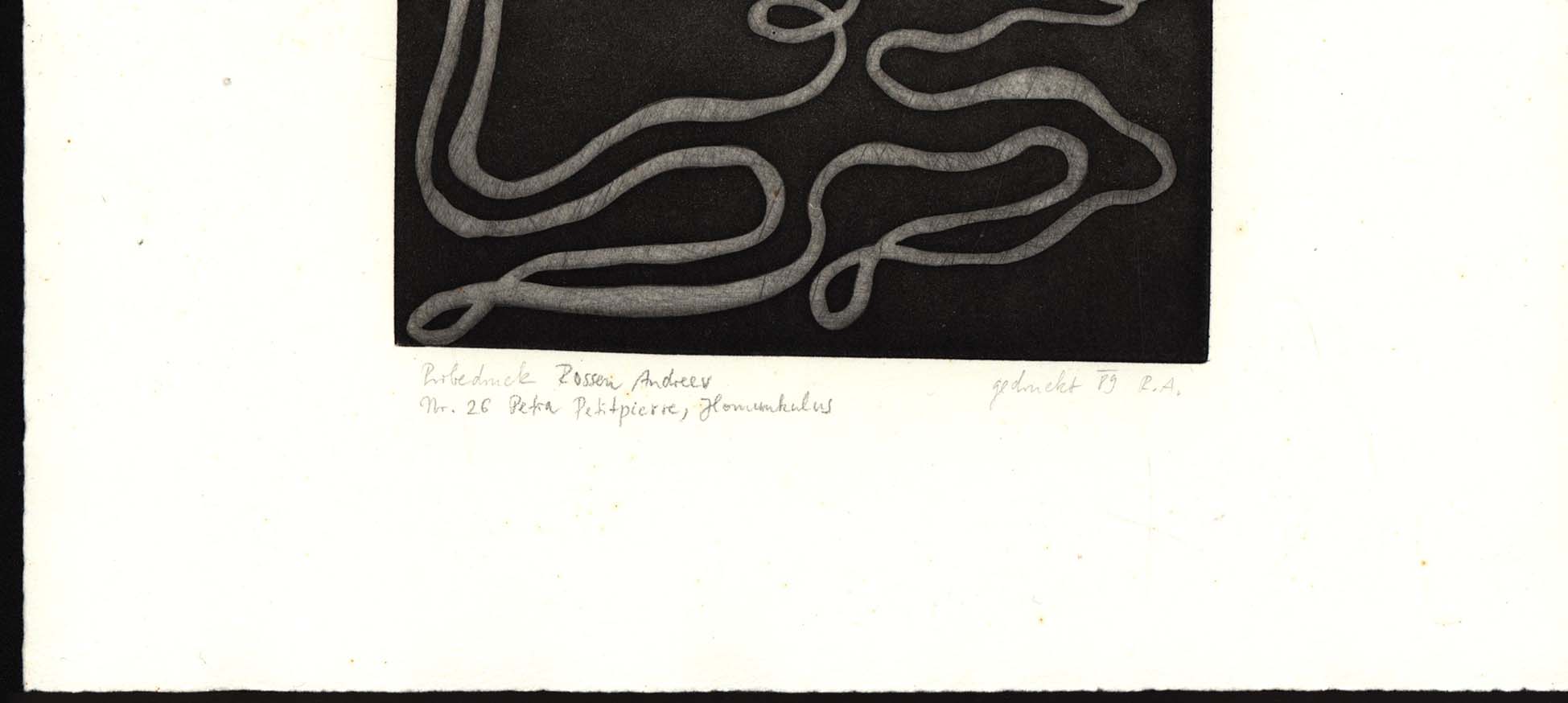 Original-Grafik von Petra Petitpierre auf Büttenpapier, am unteren Blattrand mit Bleistift als „Probedruck Rossen Andreev“ bezeichnet und mit dem Zusatz „Nr. 26 Petra Petitpierre, Homunkulus“ und „gedruckt 89 R.A.“. Nicht handsigniert, nicht nummeriert. Blattgröße: 20,0 x 27,0 cm. Abbildungsgröße: 10,0 x 14,0 cm. Blattrand mit vereinzelten winzigen Fleckchen, linker Blattrand schwach wellig. Provenienz: Aus dem Nachlass des Kunstsammlers und Autors Ralf Seilheimer, mit seiner Inventarnummer auf der Rückseite. Noch sehr guter Zustand.