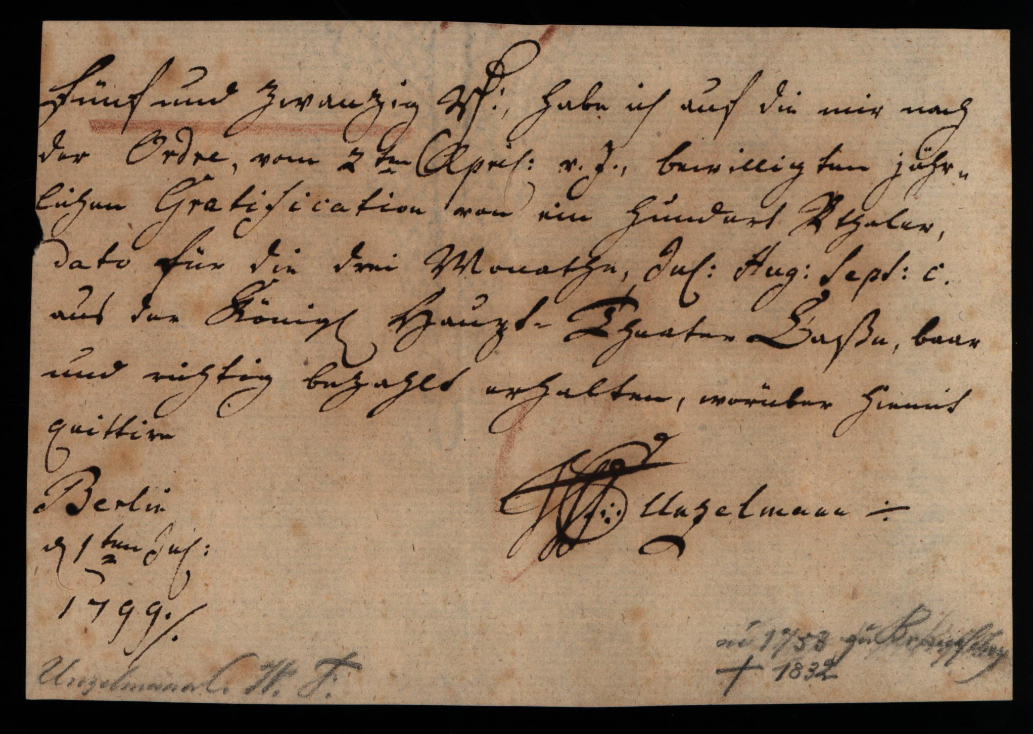 7-zeiliger handschriftlicher Brief mit eigenhändiger Unterschrift von Karl Unzelmann in schwarzer Tinte auf Papier, datiert „1. Juli 1799“. Blattgröße: 11,7 x 16,9 cm. Blatt mit Alterungsspuren, schwach braunfleckig. Linker oberer Blattrand mit winzigem Ausriss, linke Blattkante scheinbar etwas beschnitten. Unterer Blattrand mit zugesetztem handschriftlichen Vermerk mit Bleistift. Guter Zustand.