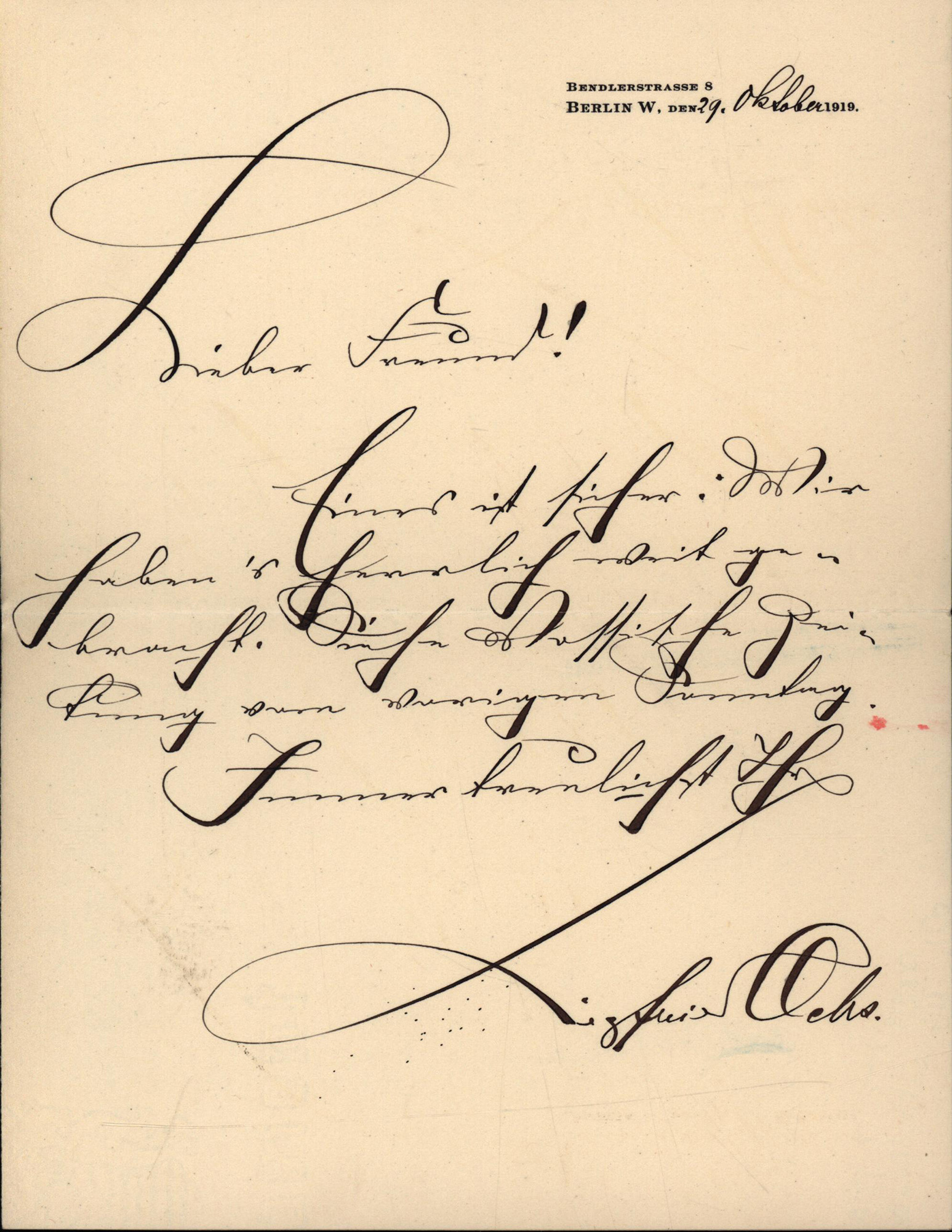 5-zeiliger handschriftlicher Brief mit eigenhändiger Unterschrift von Siegfried Ochs [an Alfred Göttmann, Herausgeber der Seutschen Tonkünstler-Zeitung mit einem Hinweis auf einen Bericht der Vossischen Zeitung „vom vorigen Sonntag“] in schwarzer Tinte auf der Vorderseite eines gefalteten Bogen persönlichen Briefpapiers mit Adressaufdruck, datiert 29. Oktober 1919. Schriftbild kalligrafisch schön gestaltet. Blattgröße: 22,0 x 17,0 cm. Brief mittig mit horizontaler Knickspur, im rechten Randbereich zwei kleine rötliche Fleckchen. Insgesamt sehr guter Zustand.