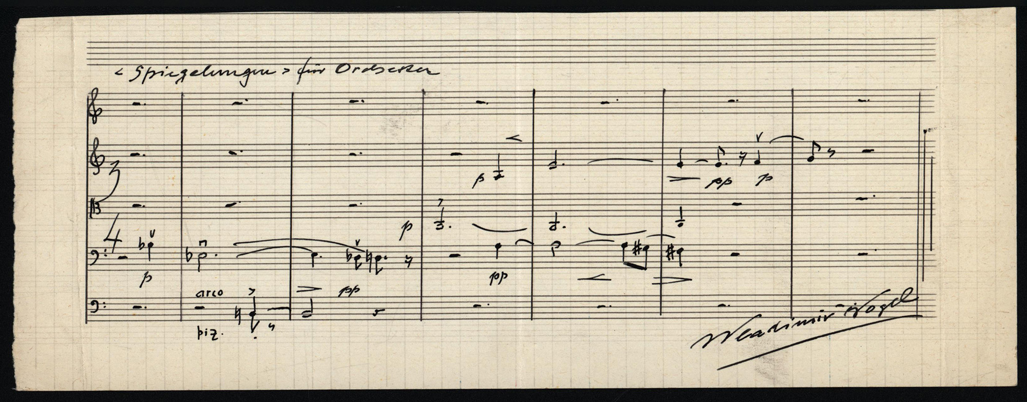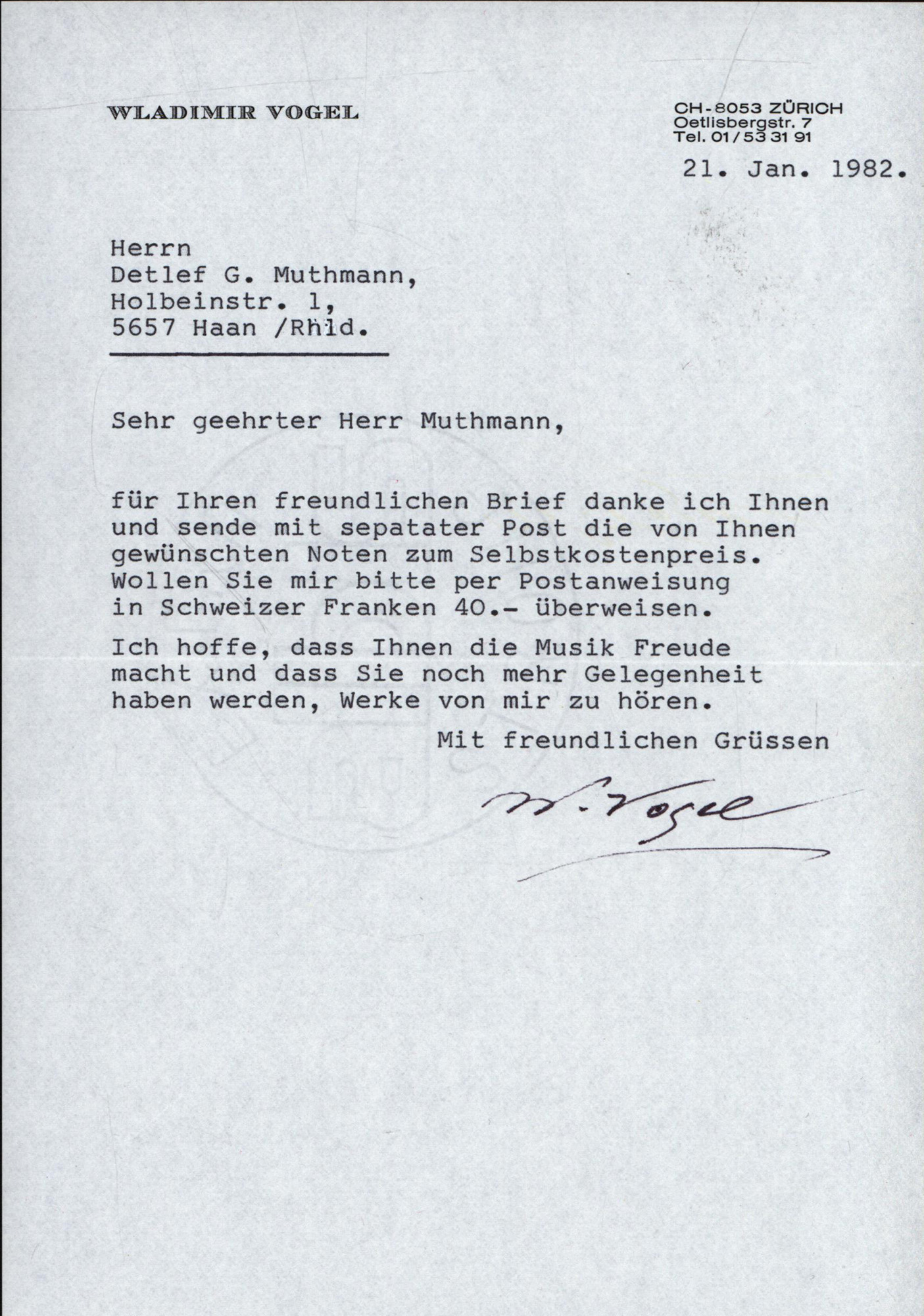 8-zeiliger maschinengeschriebener Brief mit eigenhändiger Unterschrift von Wladimir Vogel in schwarzer Tinte auf persönlichem Briefpapier, datiert 21. Jan.1982, an Detlef Muthmann, Blattgröße: 21,0 x 14,8 cm, mittig horizontal gefaltet, mit beiliegendem gelaufenen Briefumschlag. Mit einer Original-Fotografie von Max Jacoby mit einem Schwarz-Weiß-Porträt von Wladimir Vogel auf Agfa-Fotopapier, von Wladimir Vogel im unteren linken Bildbereich mit Blau auf Schwarz signiert. Foto rückseitig mit Fotografenstempel, unterer Blattrand mit kleinem Einriss (ca. 0,5 cm). Maße: 12,4 x 17,4 cm. Beiliegend ein Stück eines Notenpapiers mit 5-stimmiger Notation, übertitelt mit „<Spiegelungen> für Orchester“, unten rechts von Wladimir Vogel signiert. Blattgröße: 10,1 x 27,0 cm. Blatt mittig vertikal gefaltet. Insgesamt sehr guter Zustand.