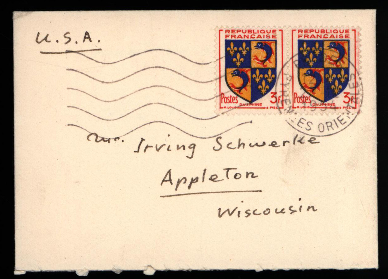 Original-Visitenkarte mit typografischem Namenszug von Pau Casals (Pablo Casals), darüber mit handschriftlichem Vermerk in schwarzer Tinte „meilleurs voeux 1955“ (allerbeste Wünsche 1955). Maße: 6,0 x 8,5 cm. Mit beiliegendem gelaufenen Original-Briefumschlag im passenden Kleinformat, von Pablo Casals handschriftlich in die USA adressiert. Briefumschlag am unteren Rand geöffnet, daher Papier dort ausgefranst. Sehr guter Zustand.