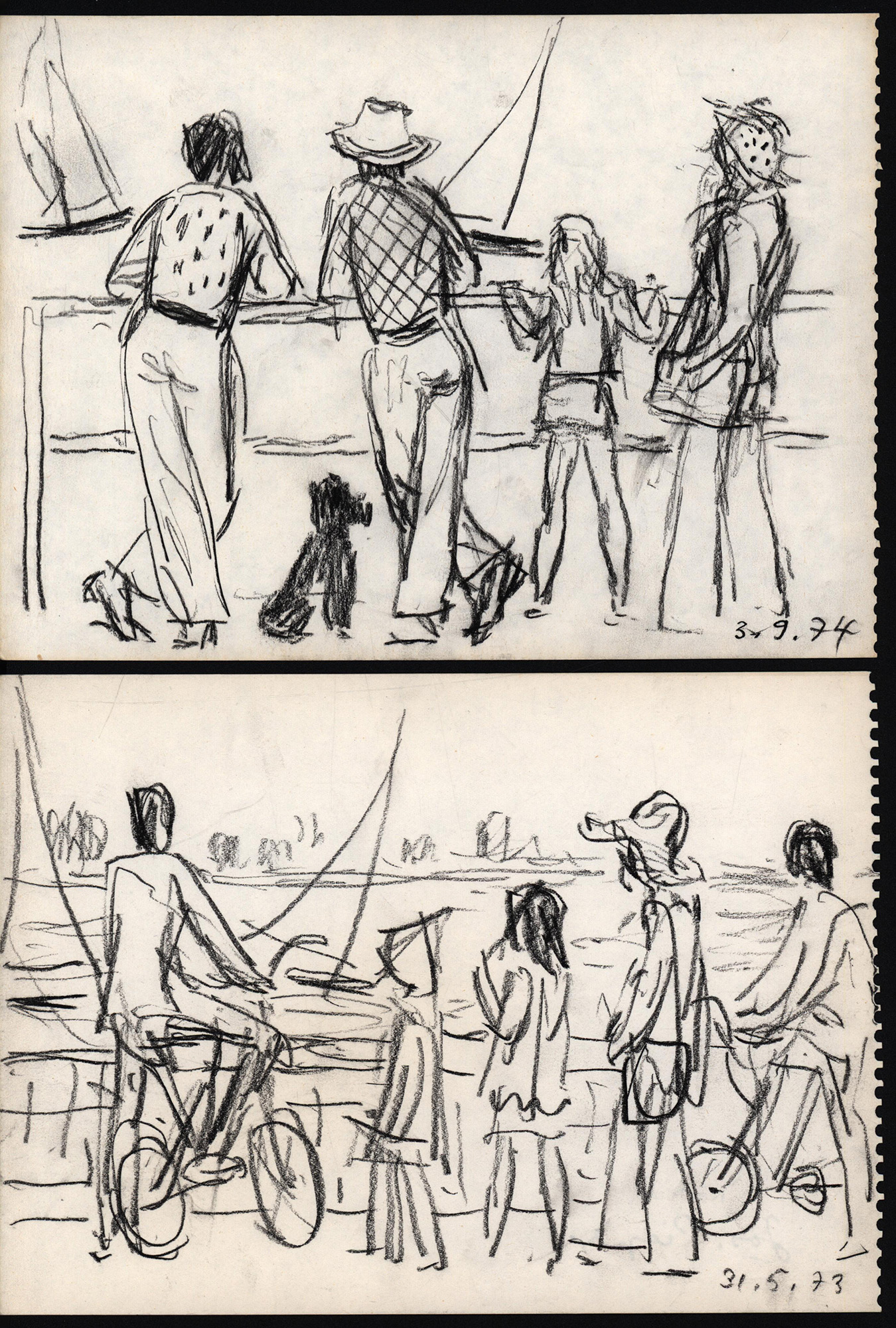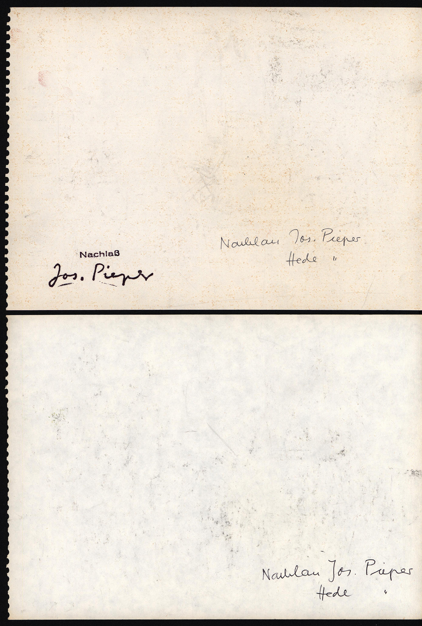 2 Original-Zeichnungen von Josef Pieper mit schwarzer Zeichenkohle auf weißem Zeichenkarton, die rechte Blattkante mit Perforation. In der unteren rechten Ecke datiert (31.05.73 und 3.9.74). Eine Rückseite mit Nachlassstempel. Provenienz: Aus der Sammlung des Fotografen Peter-Cornell Richter. Maße Blatt: je 17,0 x 23,4 cm. Sehr guter Zustand.