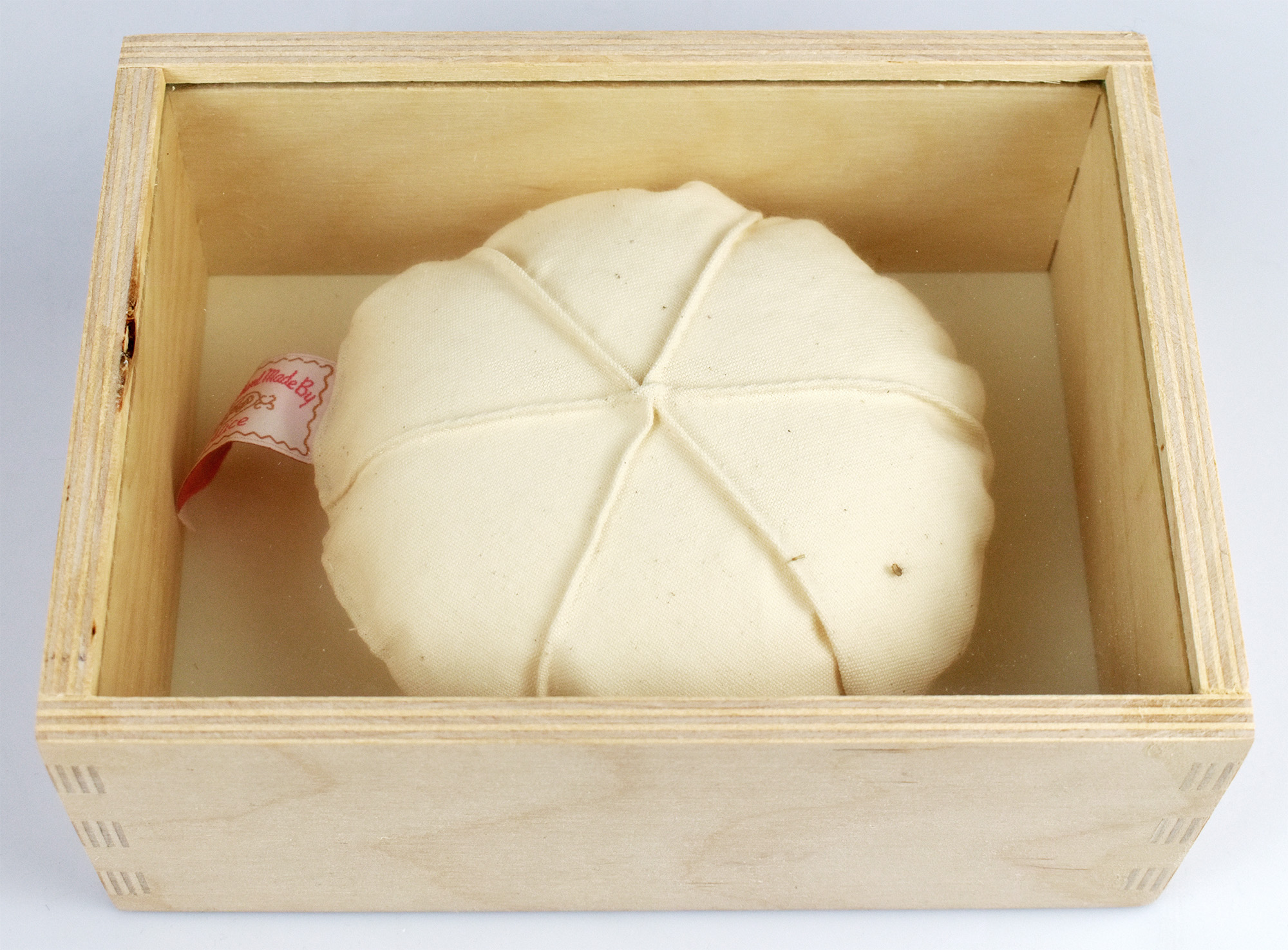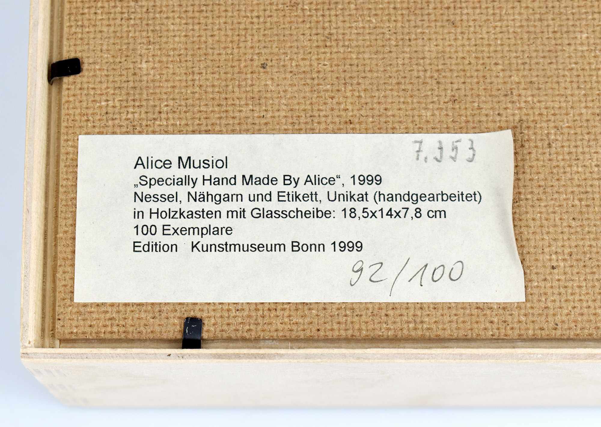Nummer 92 von 100 Exemplaren der Edition des Kunstmuseum Bonn, 1999. Rundes textiles Objekt aus naturbelassenem gewebten Nessel; handgearbeitete, zusammengenähte Patchworkarbeit [aus 7 Teilen], Durchmesser: ca. 12 cm, seitlich mit angenähtem farbigen gewebten Etikett „Specially handmade by Alice“. In einer Holzbox mit Glasscheibe, Maße: 18,5 x 14 x 7,8 cm. Box rückseitig mit montiertem Papierschild, dort nummeriert und mit beschreibendem Text bedruckt, sowie mit 2 Haken zur Wandmontage. Provenienz: Aus dem Nachlass des Kunstsammlers und Autors Ralf Seilheimer, mit seiner Inventarnummer auf dem Papierschild auf der Rückseite. Sehr guter Zustand.