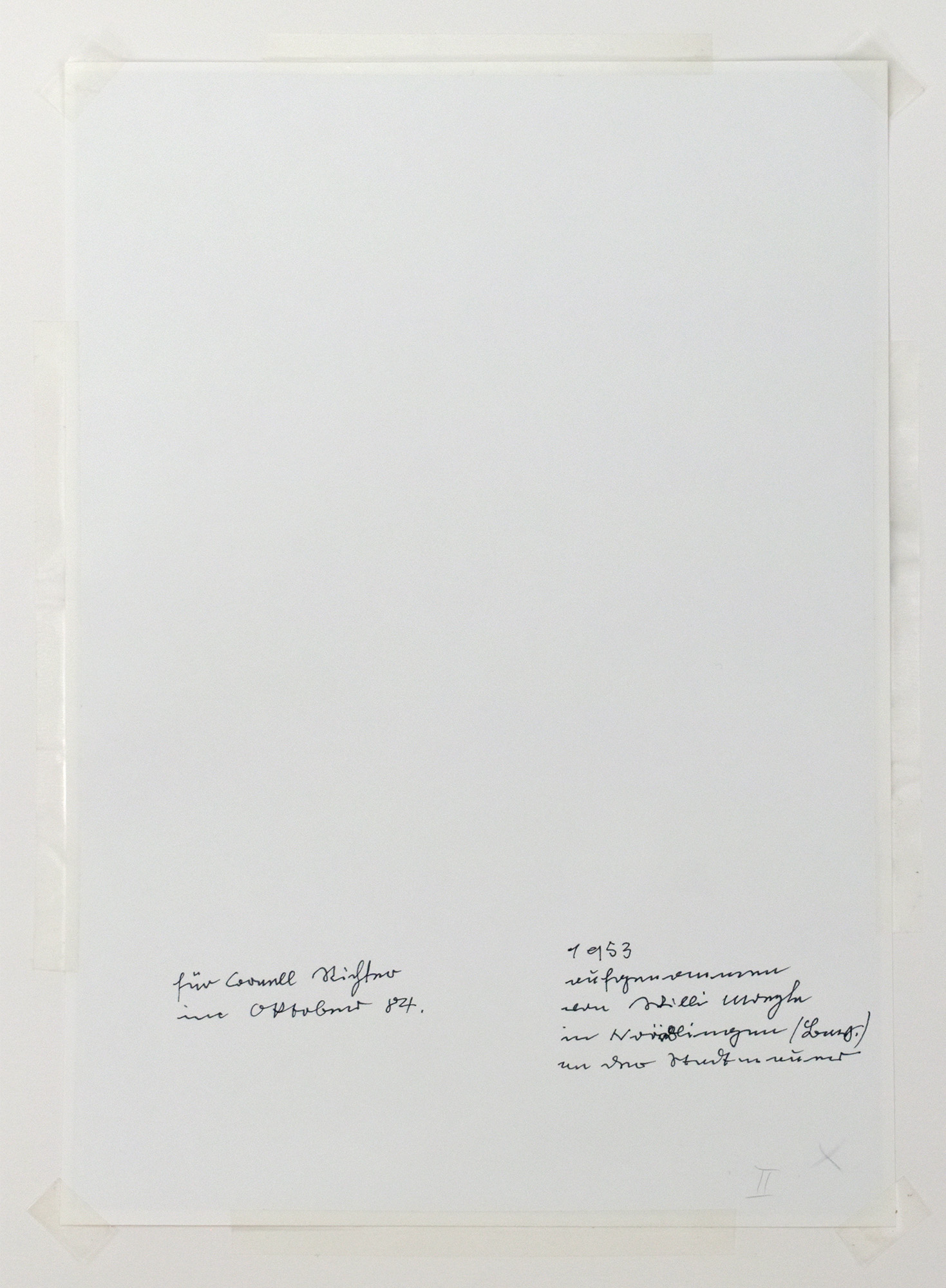 Original photograph by Willi Moegle in b/w on glossy photographic paper. Backside with a handwritten dedication to Peter-Cornell Richter by Willi Moegele in black, dated October ’84, and with handwritten details about the picture, signed. Photograph mounted with transparent tape on the backside behind a passepartout. Sheet size: 31.0 x 21.6 cm. Size passepartout: 36.3 x 50.9 cm. Provenance: From the collection of the photographer Peter-Cornell Richter. Glossy surface of the photograph with thin, almost invisible scratch marks. Fine condition.