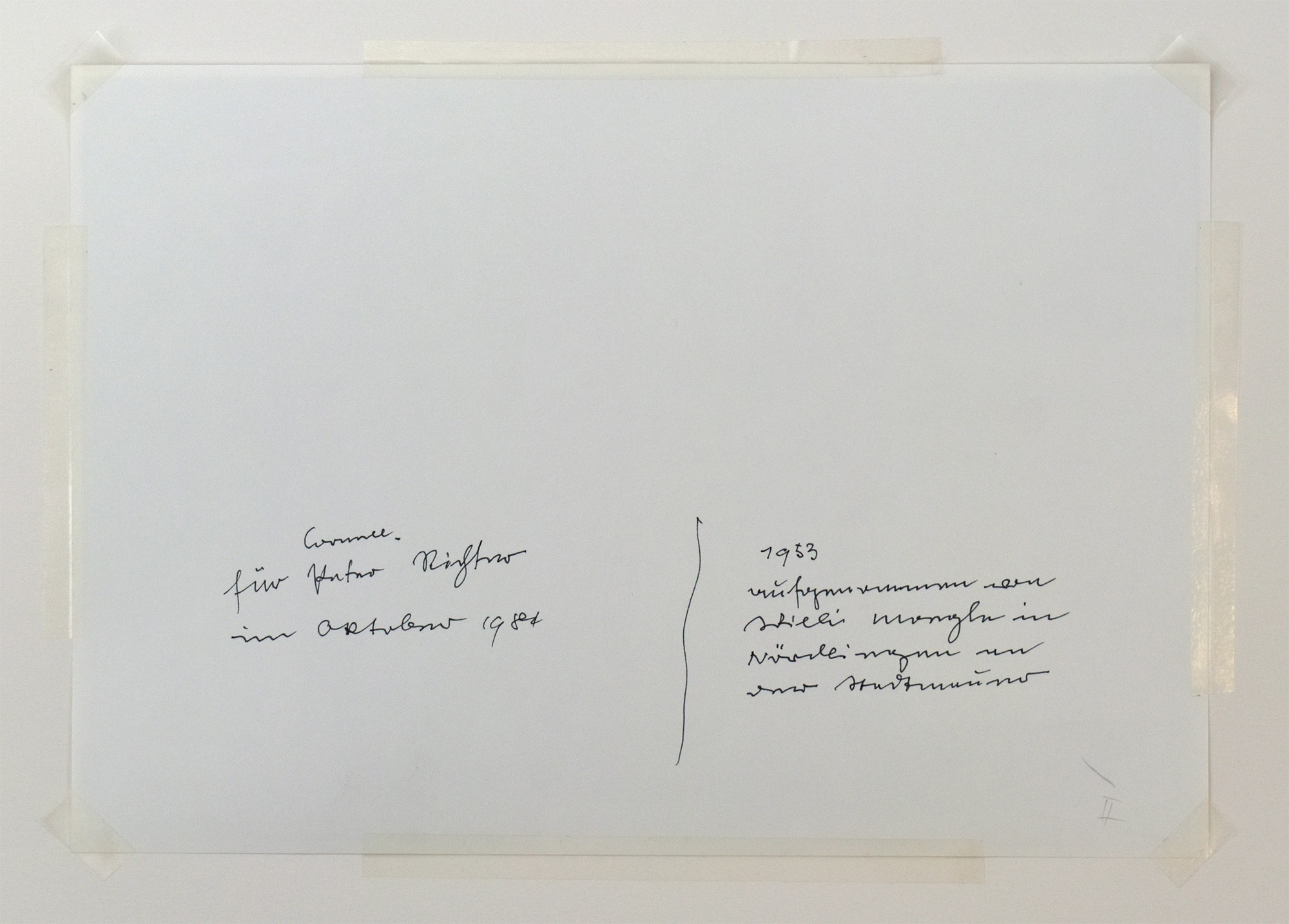 Original photograph by Willi Moegle in b/w on glossy photographic paper. Backside with a handwritten dedication to Peter-Cornell Richter by Willi Moegele in black, dated October 1984, and with handwritten details about the picture, signed. Photograph mounted with transparent tape on the backside behind a passepartout, almost completely loosened. Sheet size: 21.6 x 31.0 cm. Size passepartout: 36.3 x 50.9 cm. Provenance: From the collection of the photographer Peter-Cornell Richter. Glossy surface of the photograph with thin, almost invisible pressure lines. Fine condition.