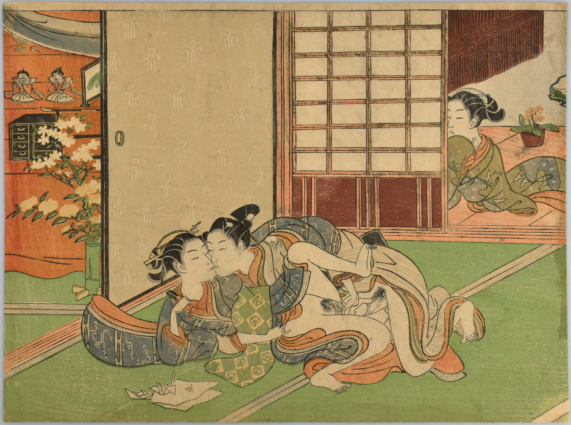 Original-Farbholzschnitt mit erotischem Motiv von Suzuki Harunobu auf Japanpapier, aus: Japanese Erotic Fantasies, Blatt 16. Blattgröße: 20,6 x 27,6 cm (Chuban). Blattrückseite mit kleiner Nummerierung mit Bleistift und winzigen Klebespuren an den Blattkanten. Insgesamt sehr guter Zustand.