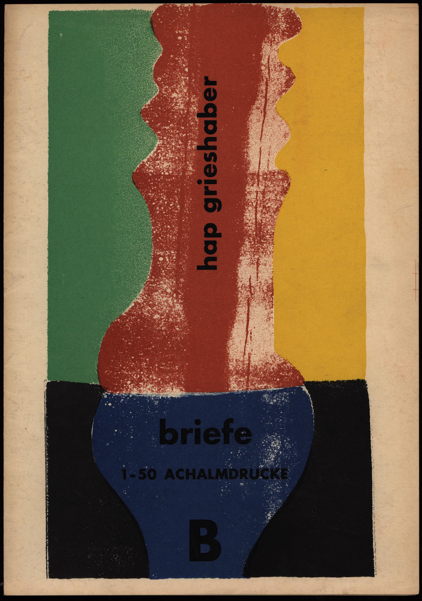 Braune Faltmappe aus Papier mit einem faksimiliertem Korrekturbogen von HAP Grieshaber, rückseitig mit 2-farbigem Holzschnitt, Maße: 29,5 x 41,5 cm, mittig gefaltet und am Blattrand etwas knickspurig, ein kleiner Randeinriss (ca. 2 cm). Firmenschrift der Werbeagentur Brose und Partner zu Weihnachten 1966, hierzu in der Mappe gedruckter Text. Beiliegend ein Faltbogen mit dem Titelaufdruck „hap grieshaber, briefe, 1-50 achalmdrucke, B“, hierin ein 4-seitiger faksimilierter Malbrief an Margot [Fürst] im DIN-A4-Format. Guter bis sehr guter Zustand.