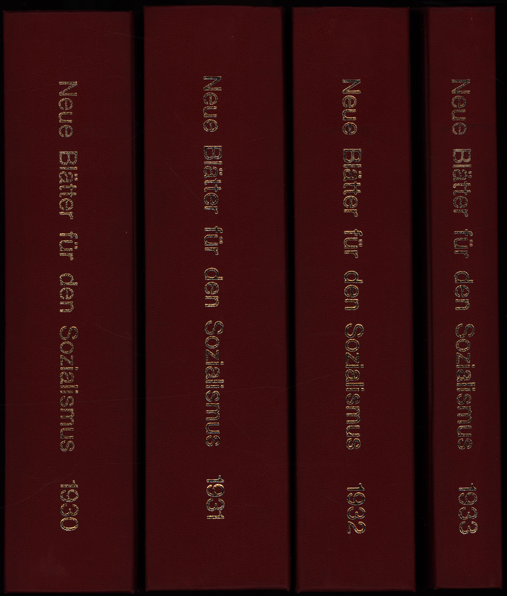 Neue Blätter für den Sozialismus. Jahrgang 1930-1933. 4 Bände (komplett). Potsdam, Verlag Alfred Protte, 1930-1933. 8°. 22 x 14,5 cm. 575; 639; 671; 322 Seiten. Bibliothekseinbände in Kunstleder mit goldgeprägtem Rückentitel. Original-Broschuren eingebunden.